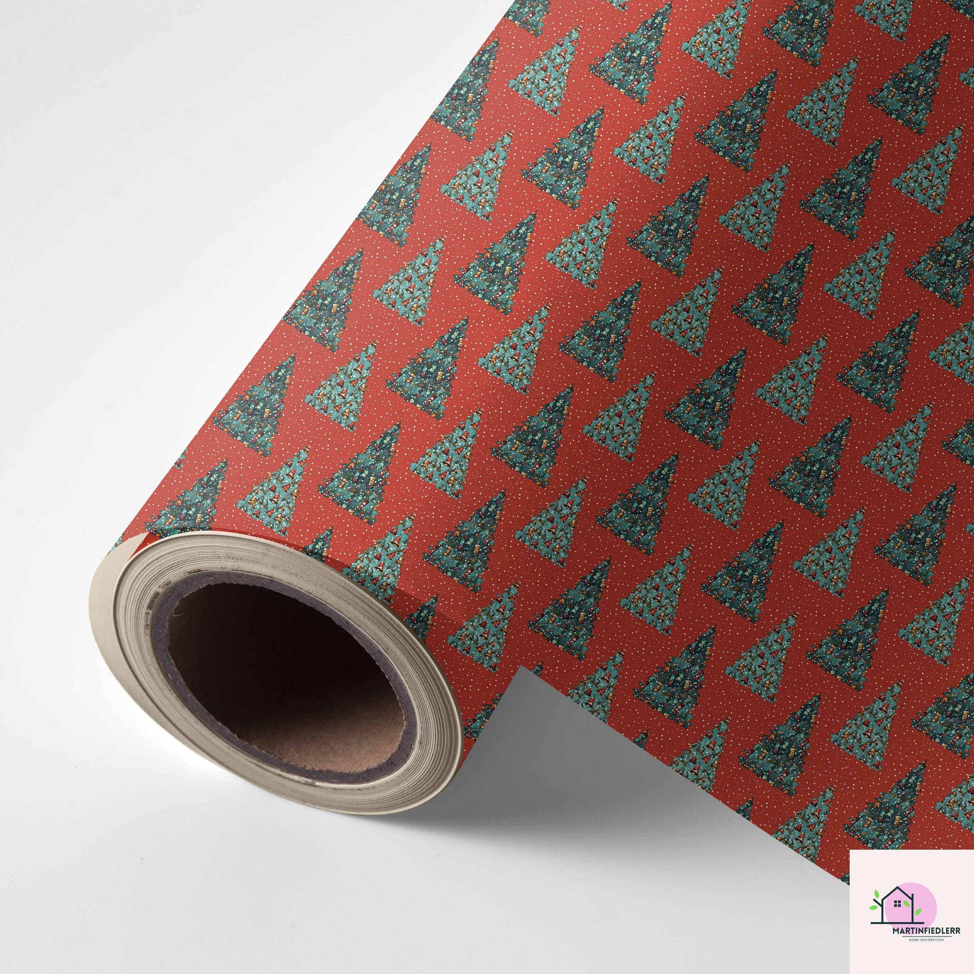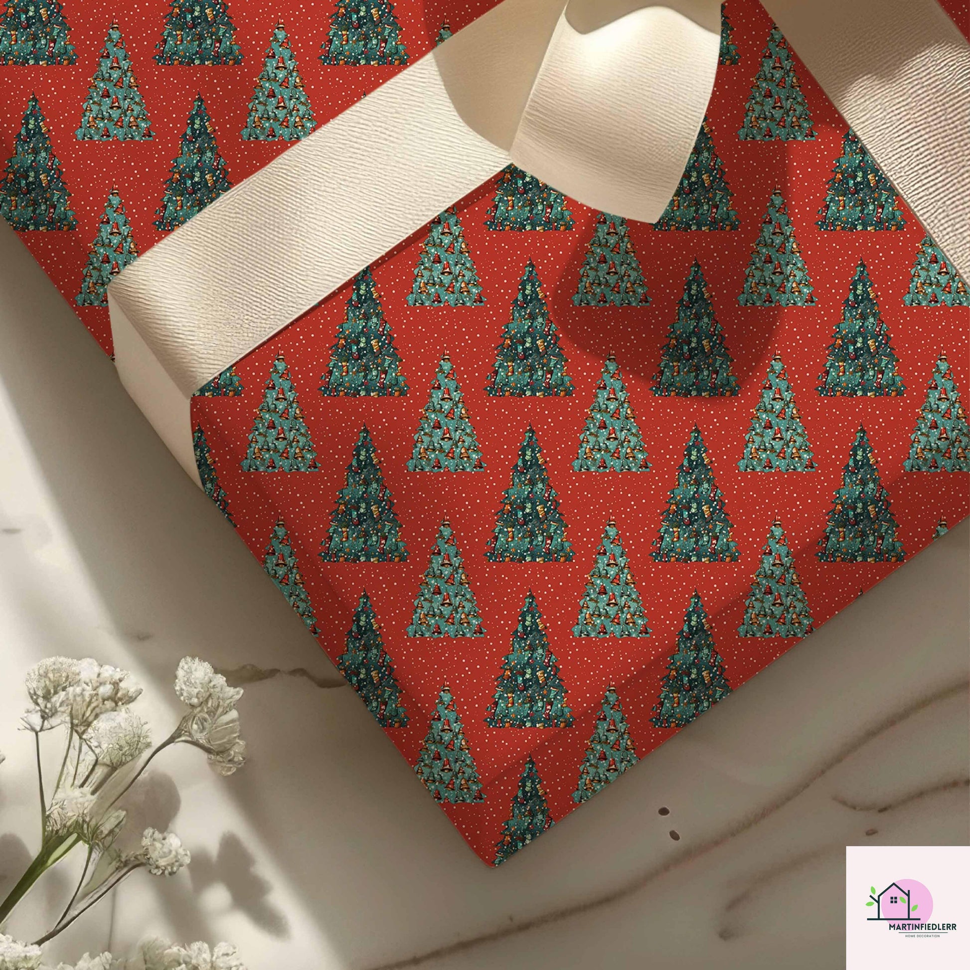 Red Christmas Tree Wrapping Paper, Holiday Gift Wrap Sheets, Festive Green Pine Forest Packaging, Traditional Winter Seasonal Style
