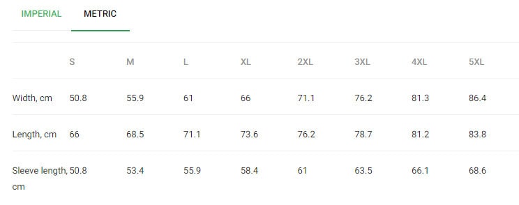 | US Size | Chest (Inch) | Chest (Cm) | Length (Inch) | Length (Cm) | Sleeve (Inch) | Sleeve (Cm) |