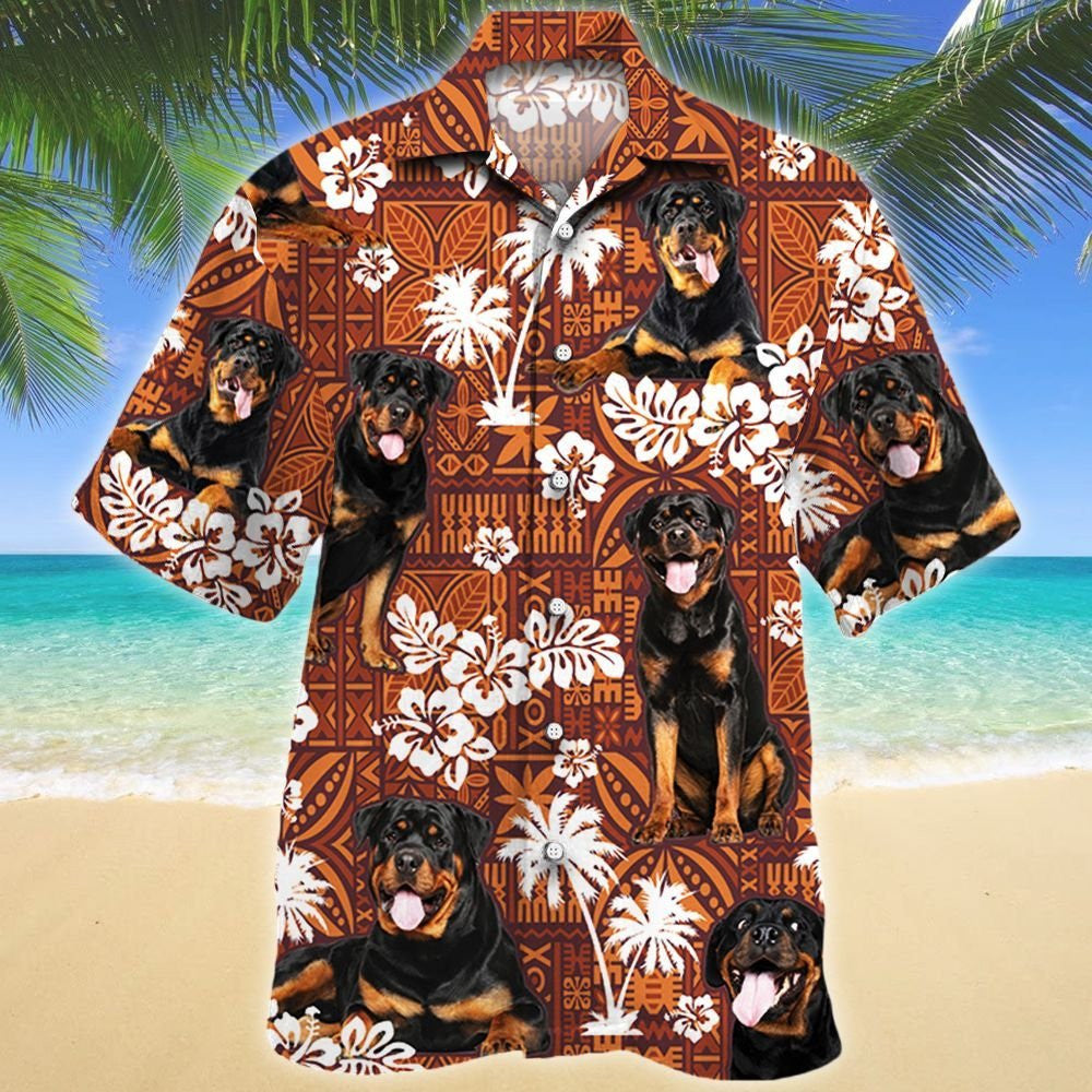 Madra Rottweiler Agus Hibiscus ar Phatrún Donn Treibhe Léine Haváís, Bronntanas Léine Haváíais, Bronntanas Nollag