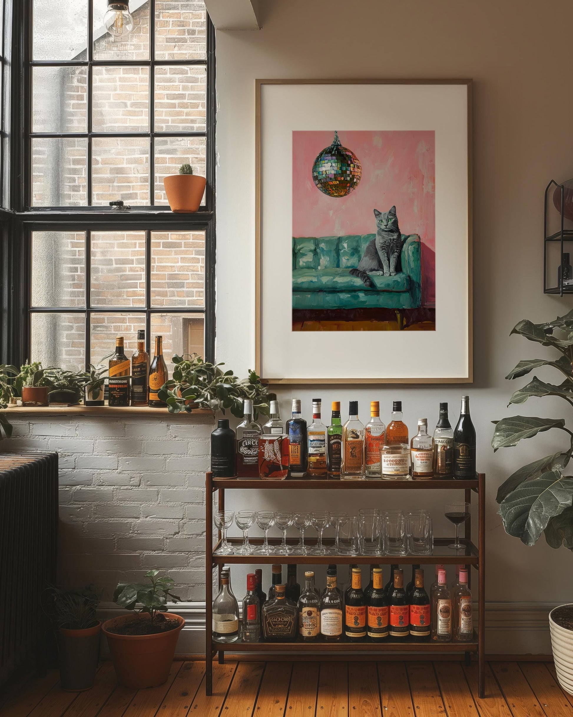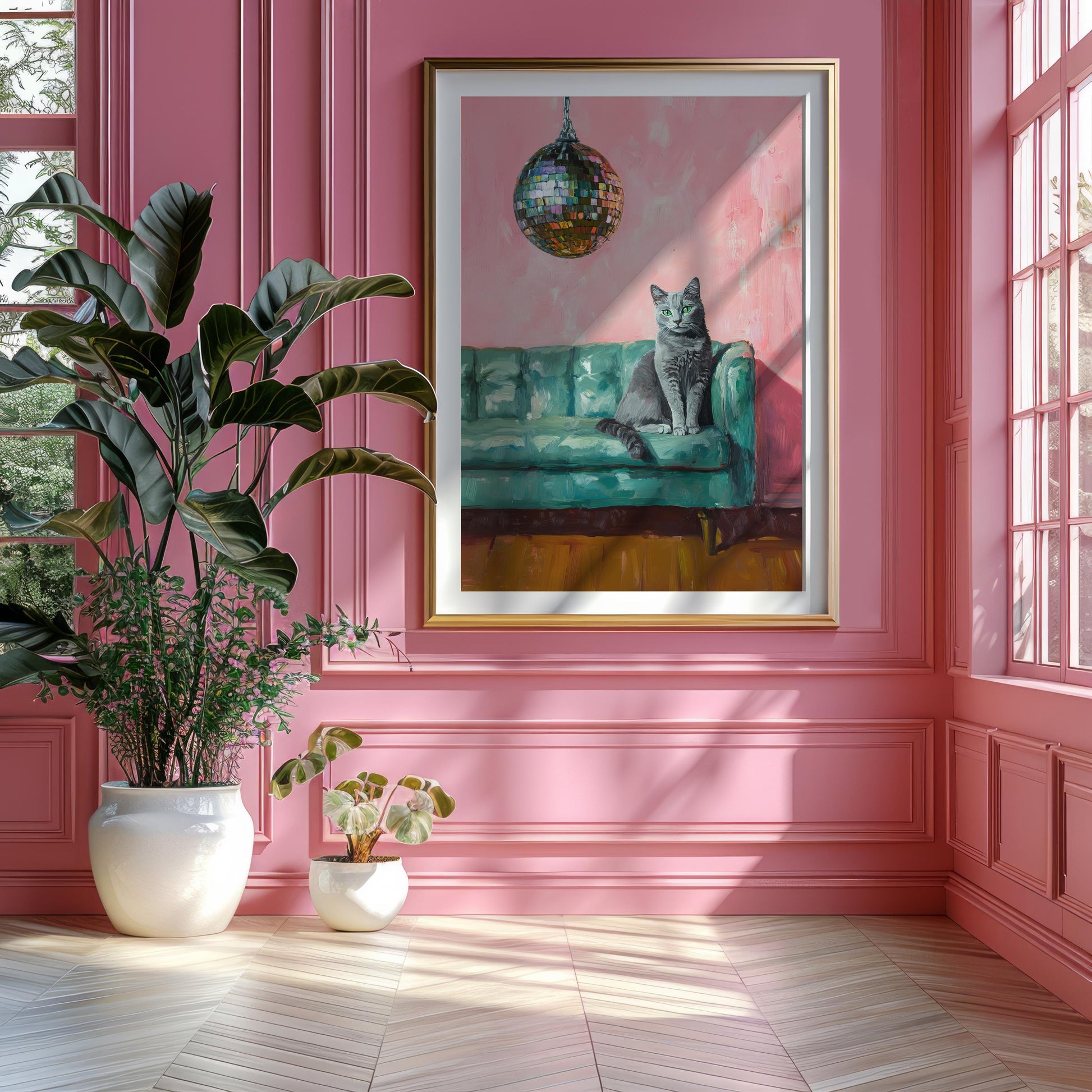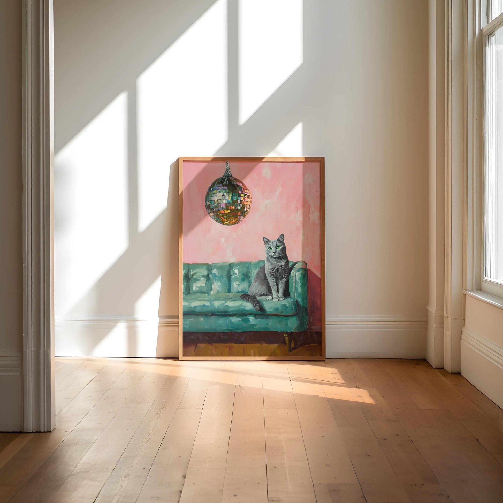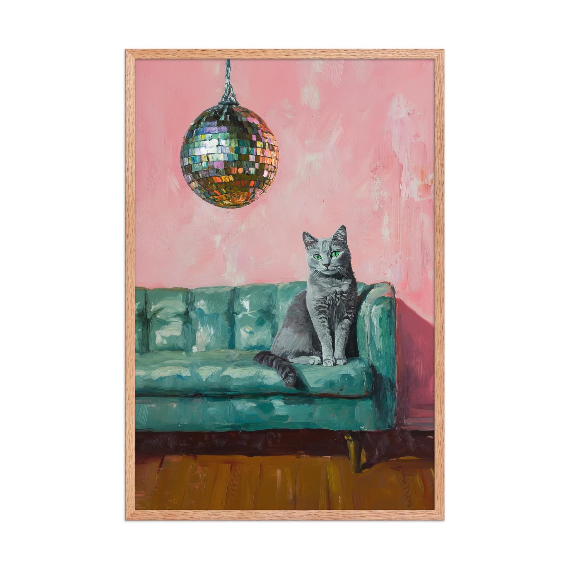 Russian Blue Cat with Disco Ball Fine Art Print | Cute Quirky Whimsical | Disco Ball Cat | Bar Cart Decor | Trendy Home Wall Art Gift
