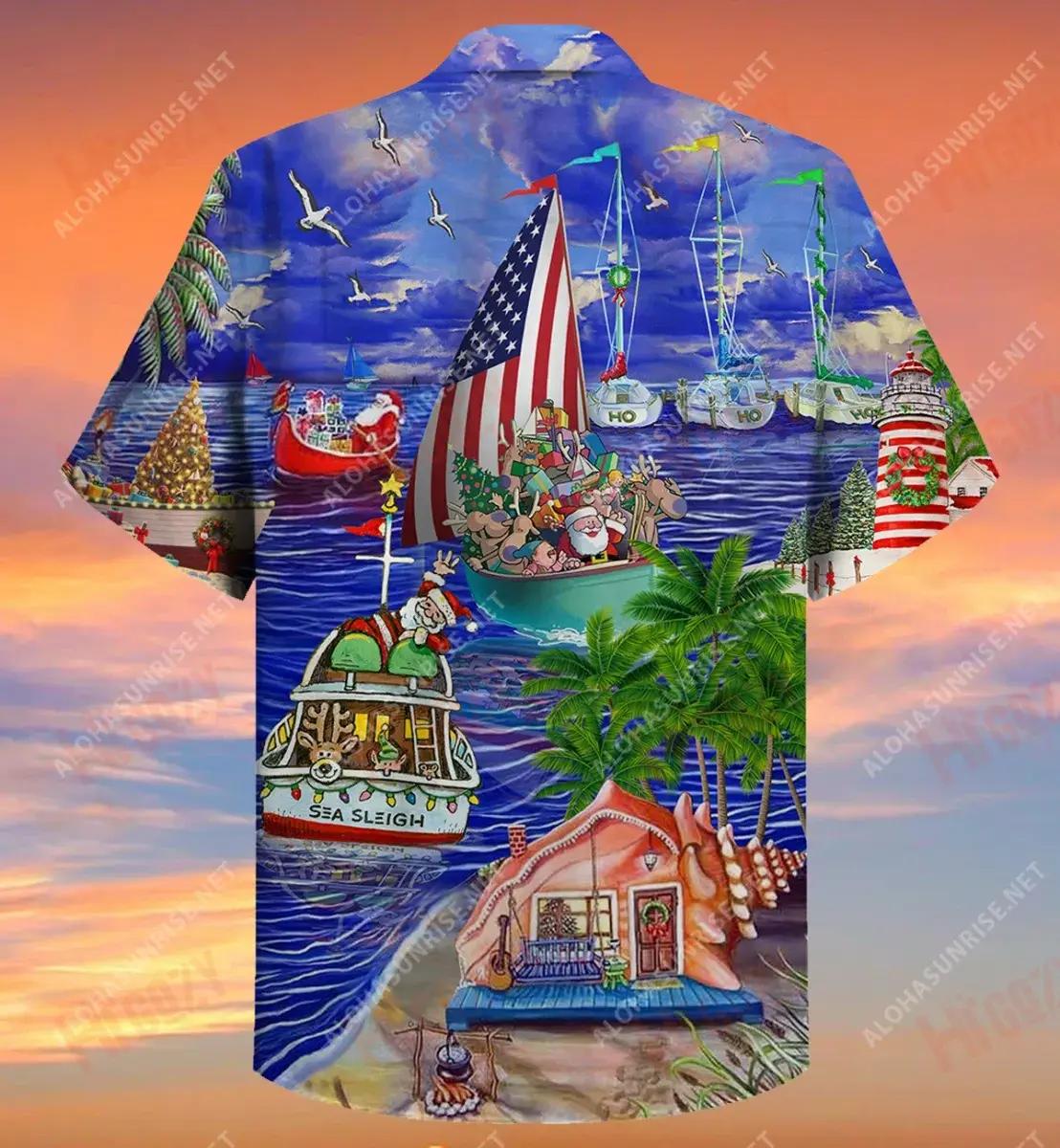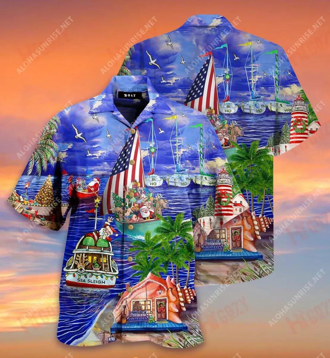 Daidí na Nollag ar Muir Bád Sleigh Teacht Chuig na Nollag Léinte Gearr Haváís Laethanta Saoire Léinte Tropacha Léinte Grinn Haváí Léinte Greannmhar Haváise, Bronntanas Léine Haváís, Bronntanas Nollag