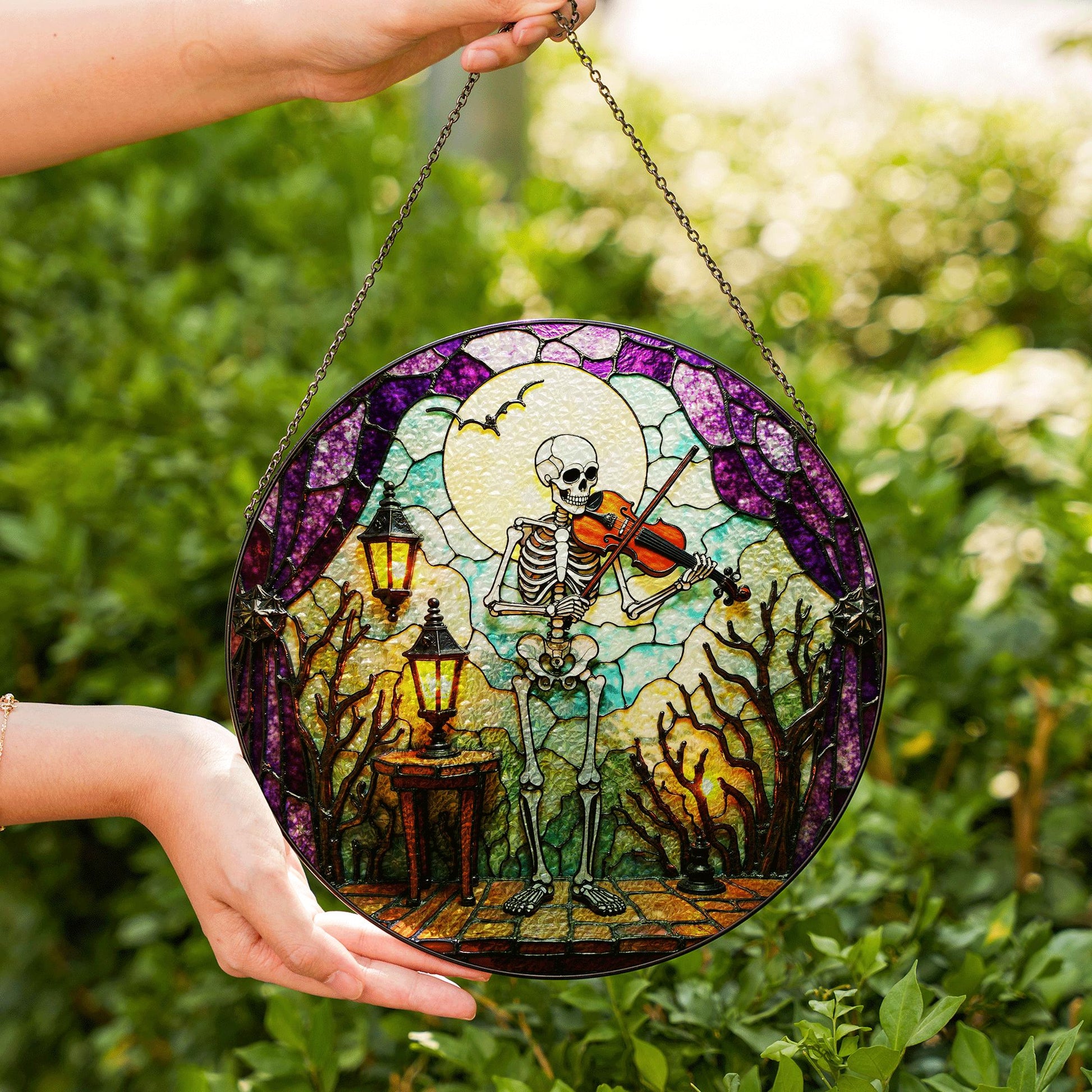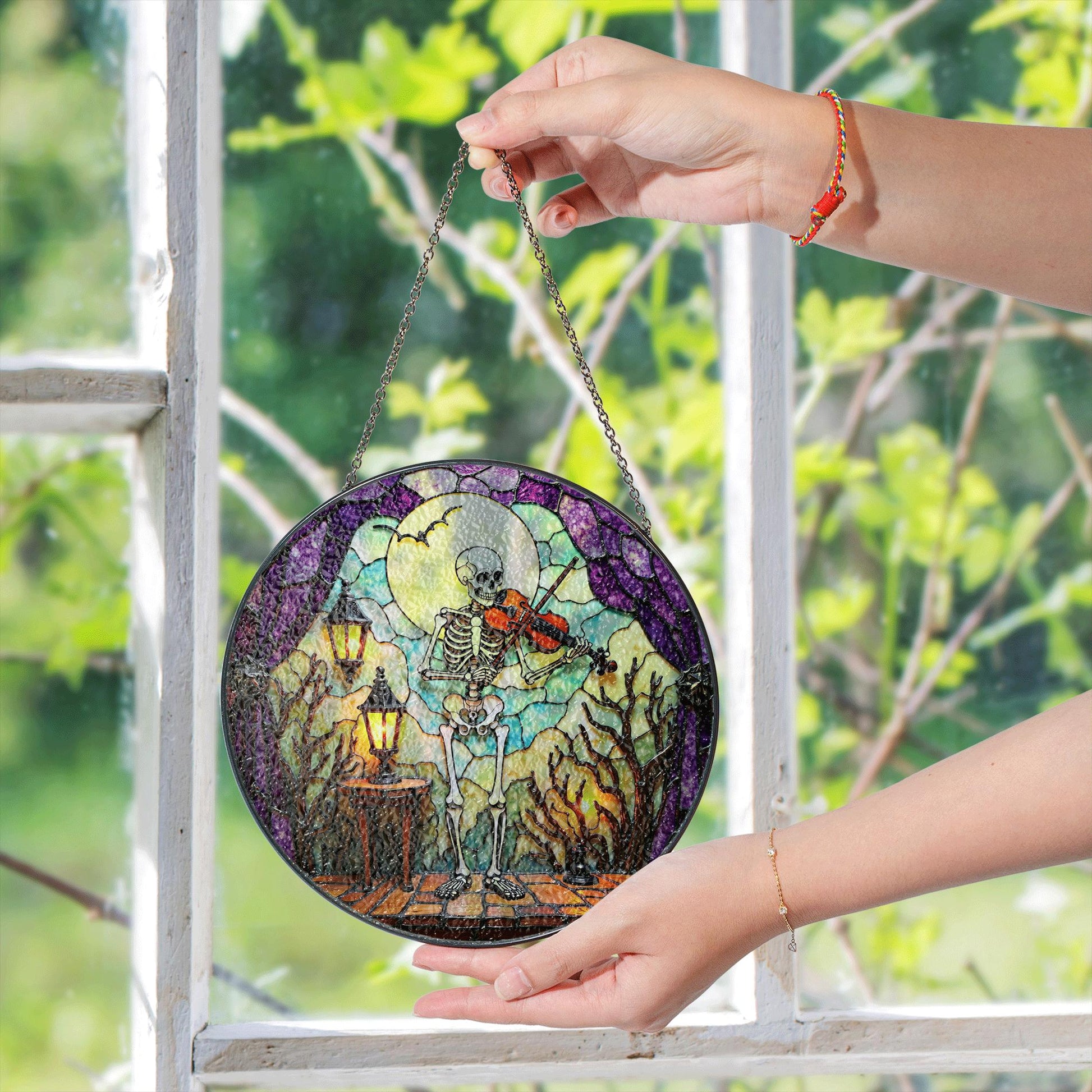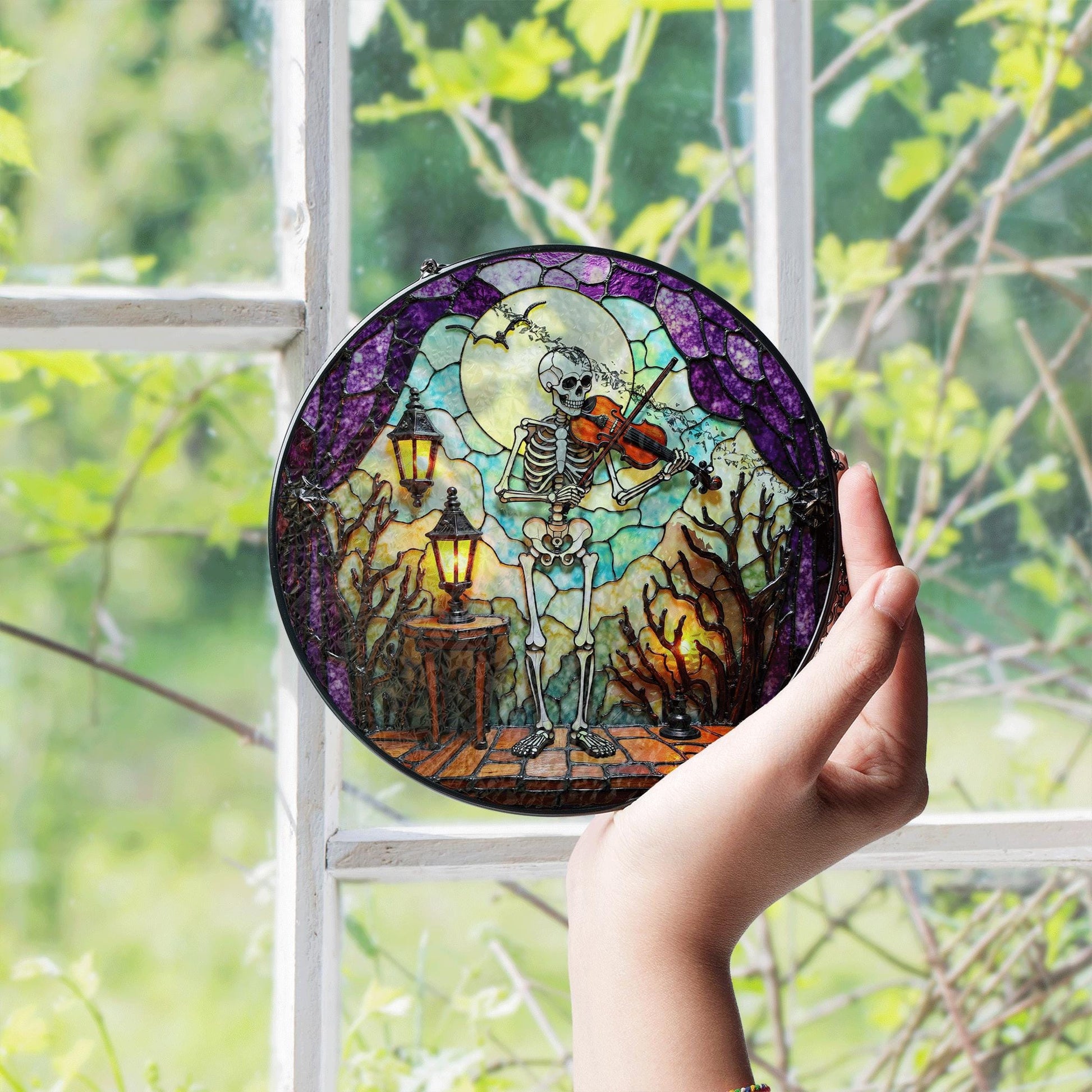 Skeleton Playing Violin Spooky Stained Glass Suncatcher Halloween Gothic Gift