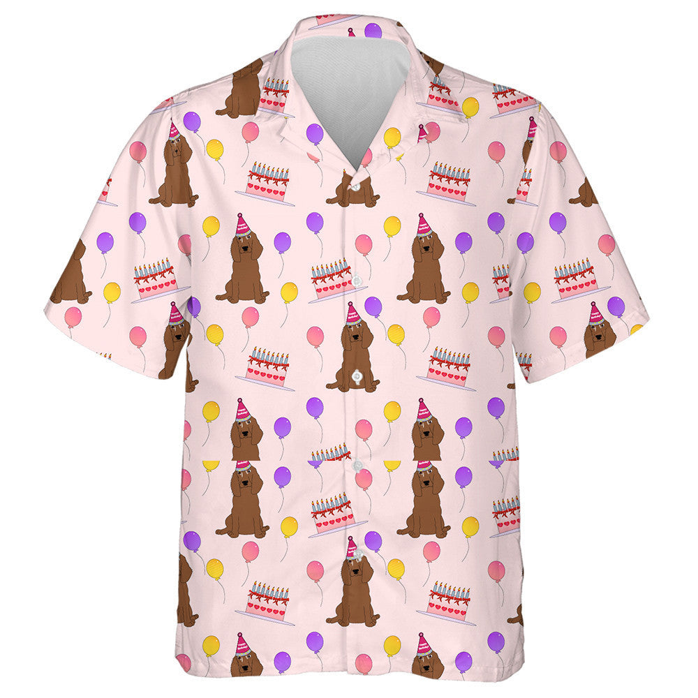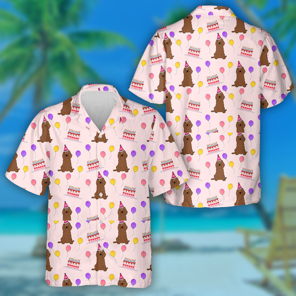 Madraí Spaniel Agus Cácaí Breithlá i gCúlra an Chartúin Léine haváí, Bronntanas Léine Haváíais, Bronntanas Nollag