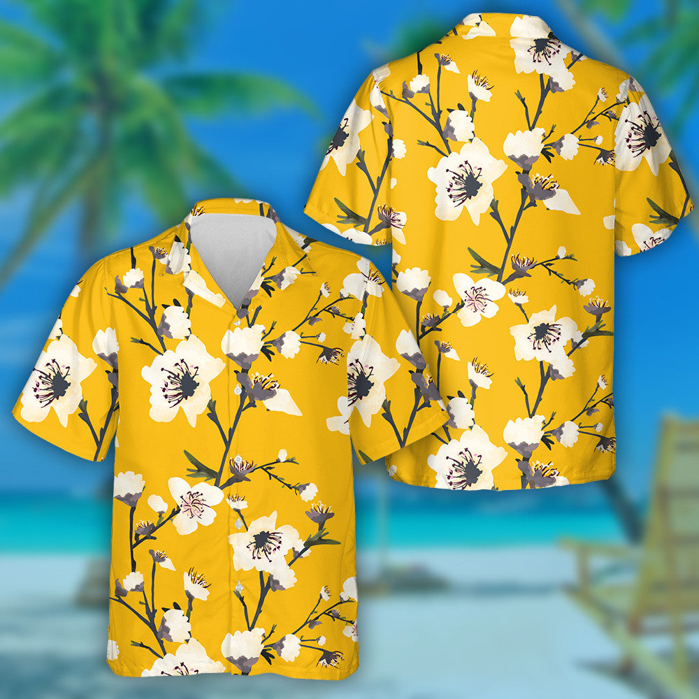 Bláthanna an Earraigh Brainsí Bláthanna Bána ar Chúlra Buí Léine Haváís, Bronntanas Léine Haváís, Bronntanas Nollag