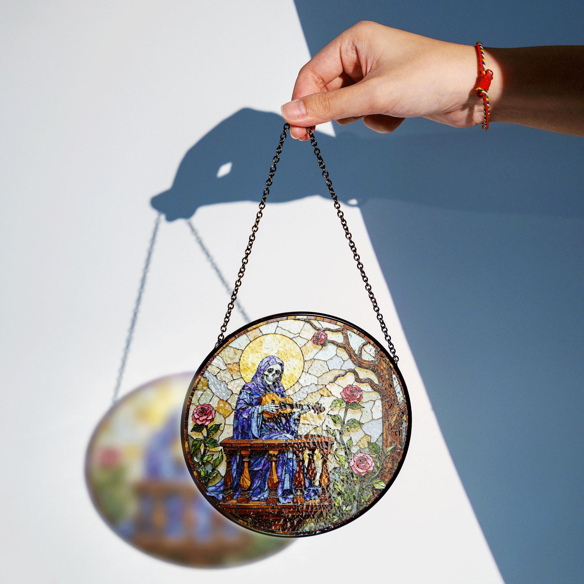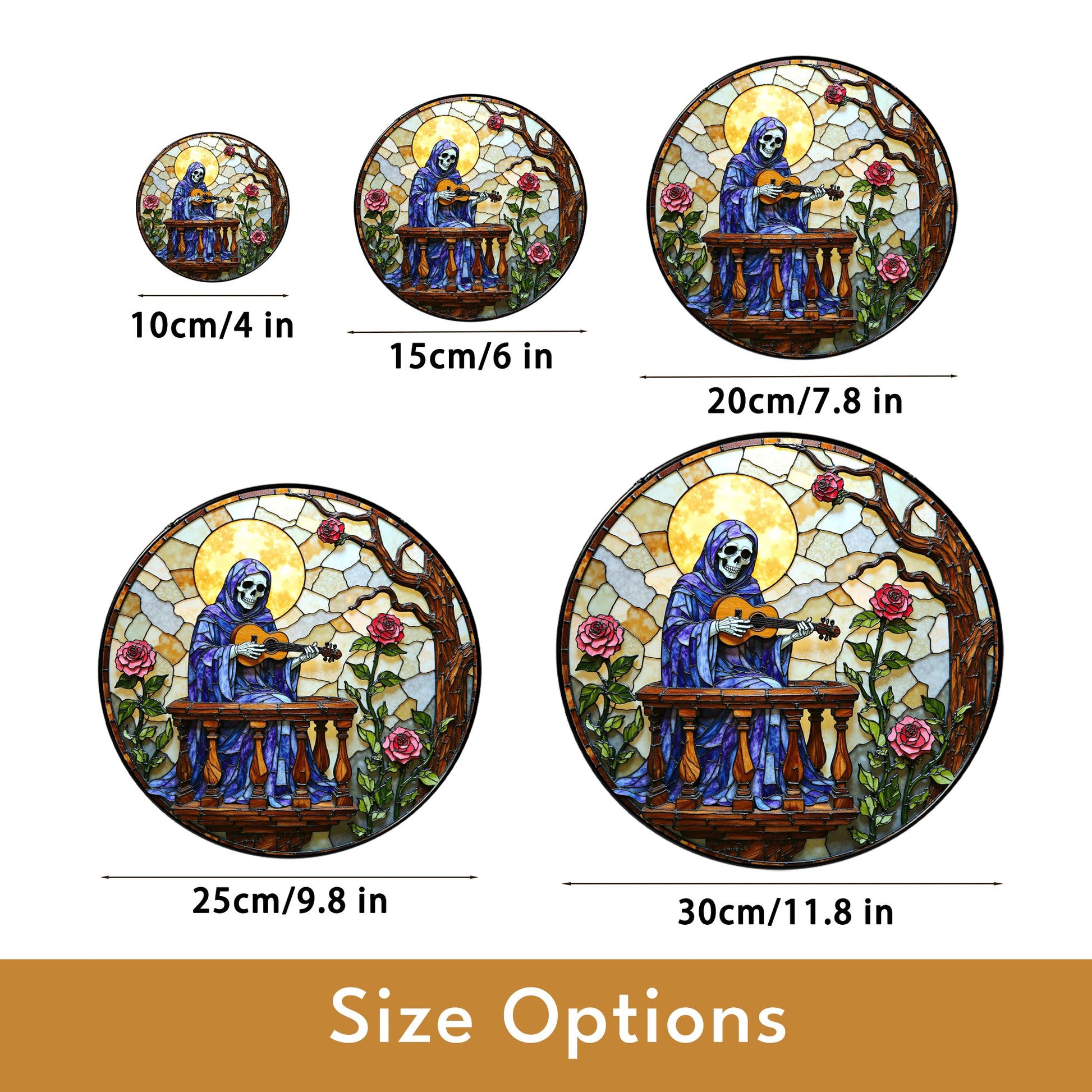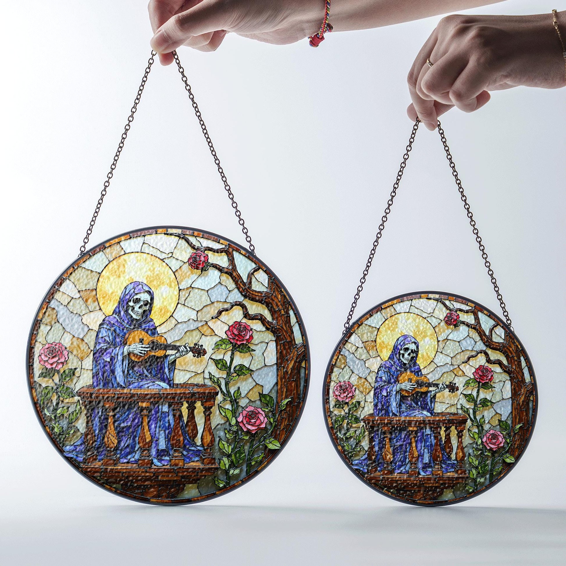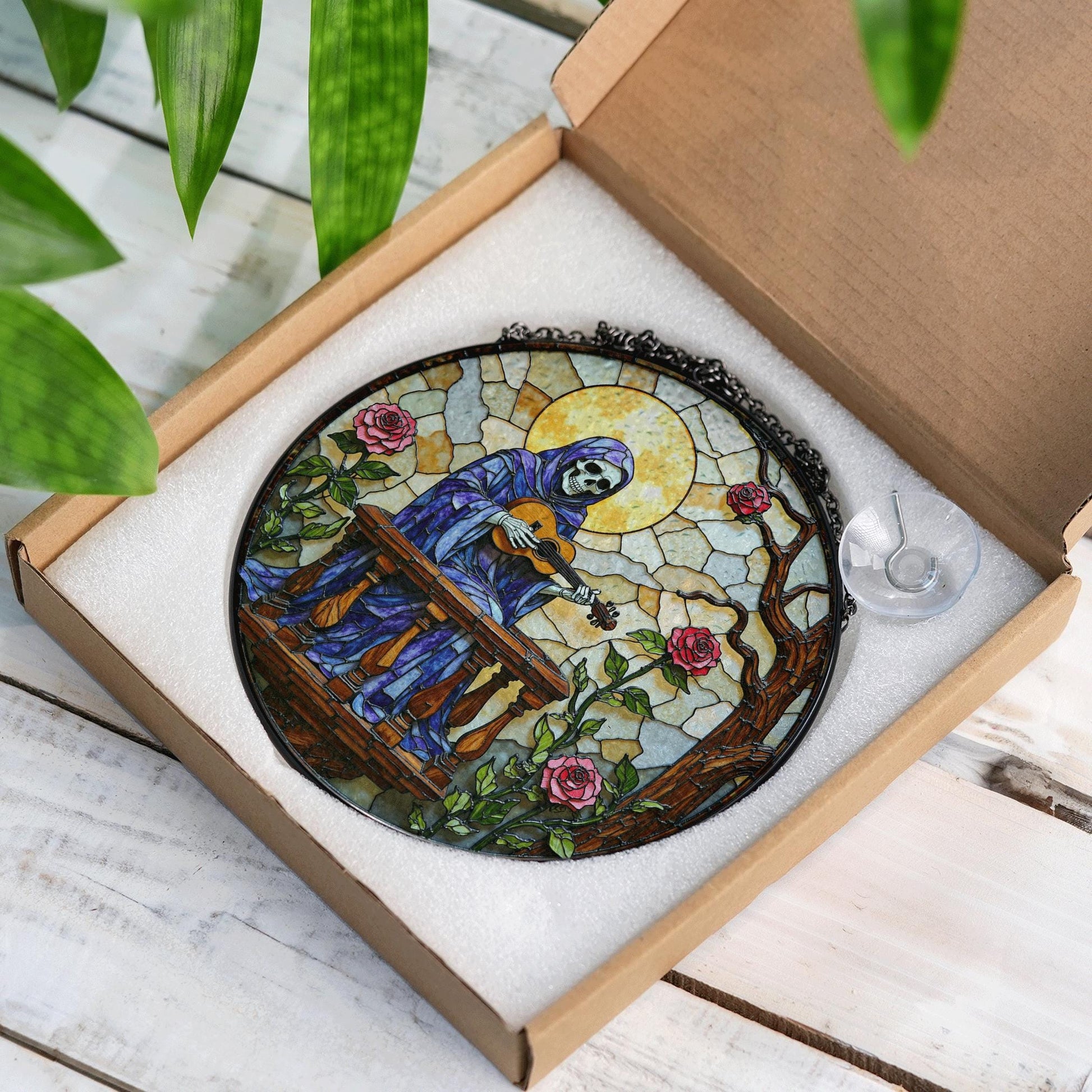 stained glass suncatcher skeleton playing guitar with roses gothic halloween gift