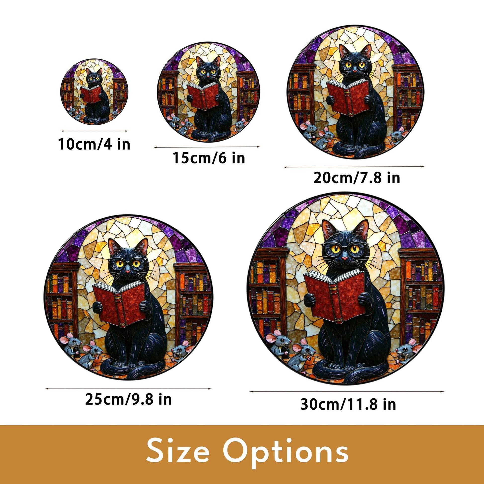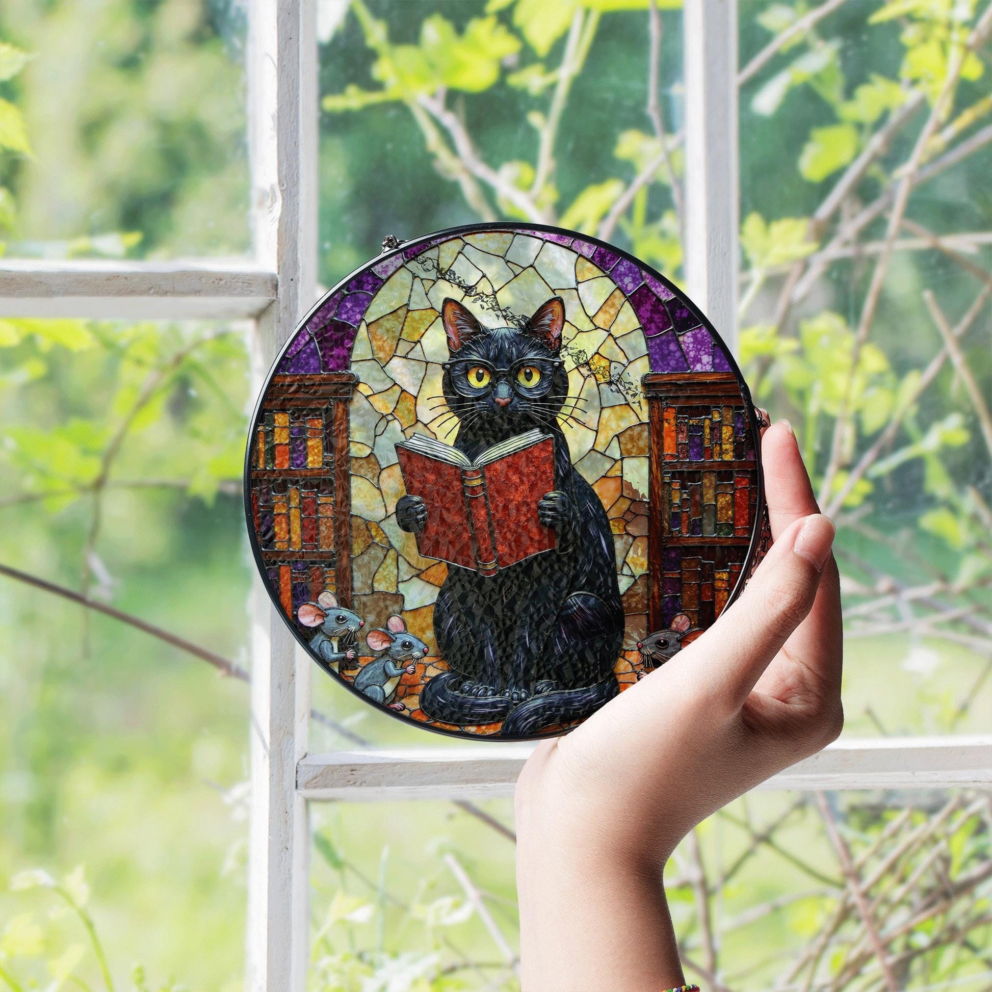 Suncatcher stained glass black cat reading book library scene gift for mom Halloween gift Christmas gift