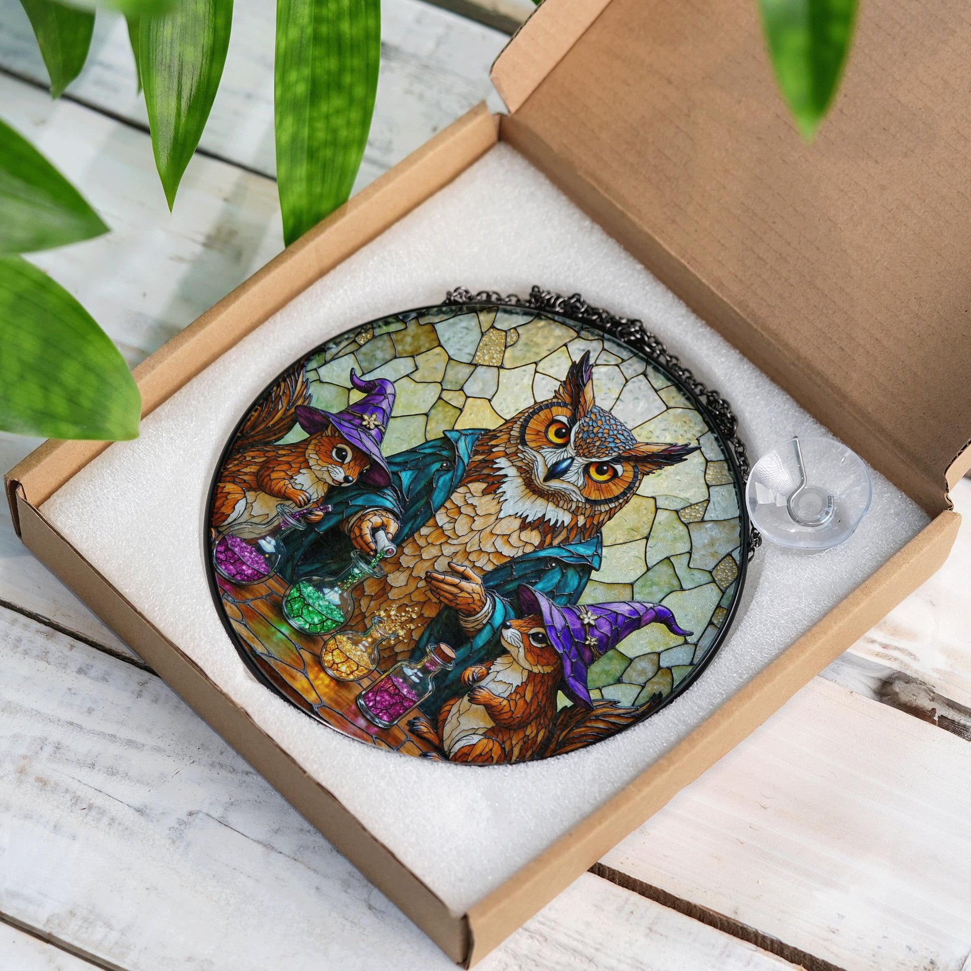 Suncatcher stained glass owl with potion bottles Halloween gift for mom Christmas gift