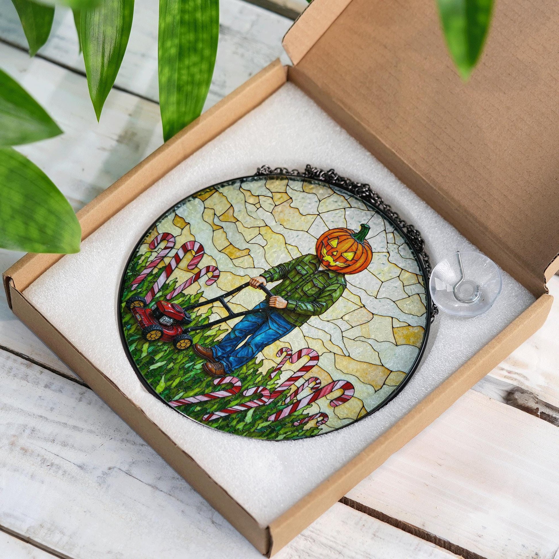 suncatcher stained glass pumpkin head man mowing candy cane field Halloween gift Christmas gift