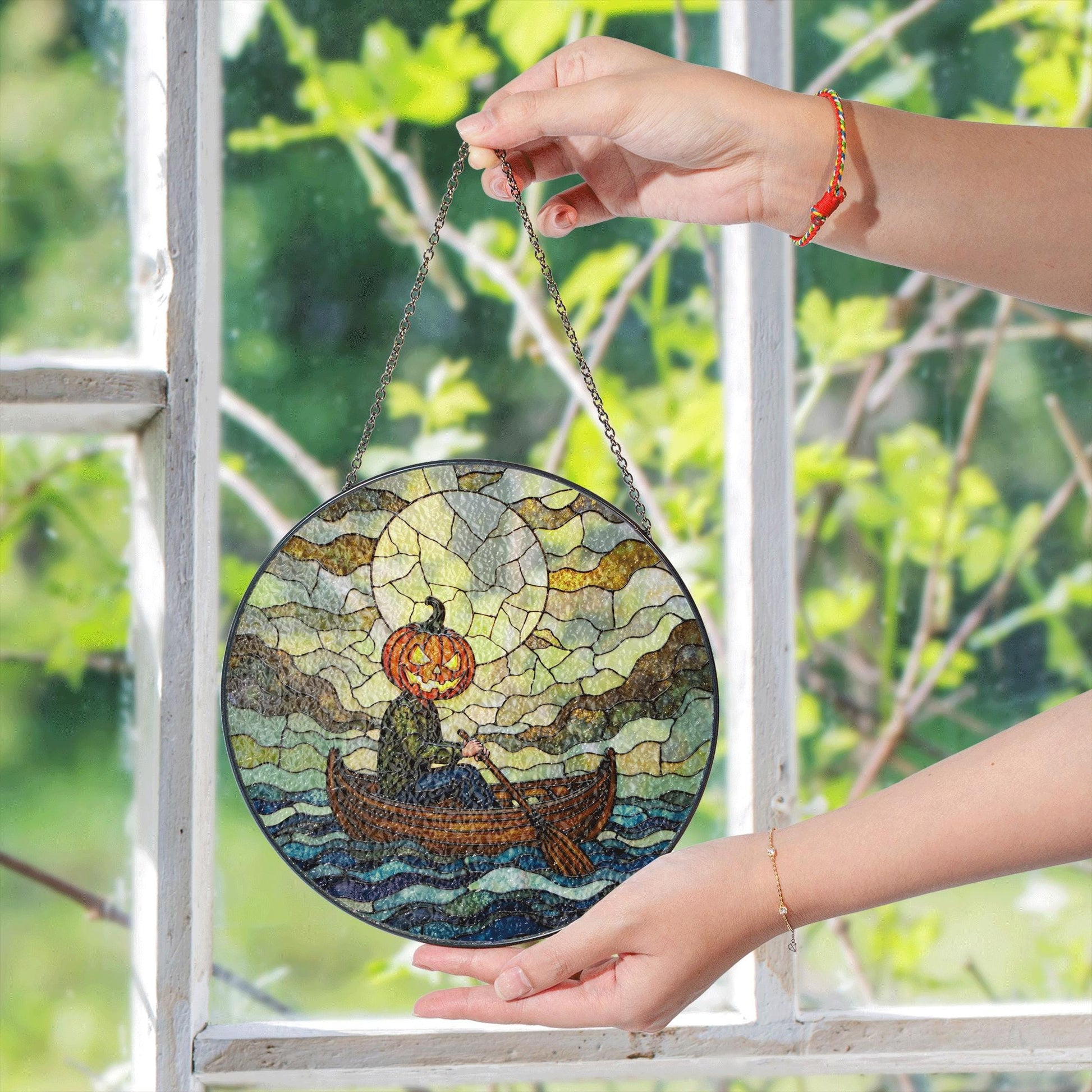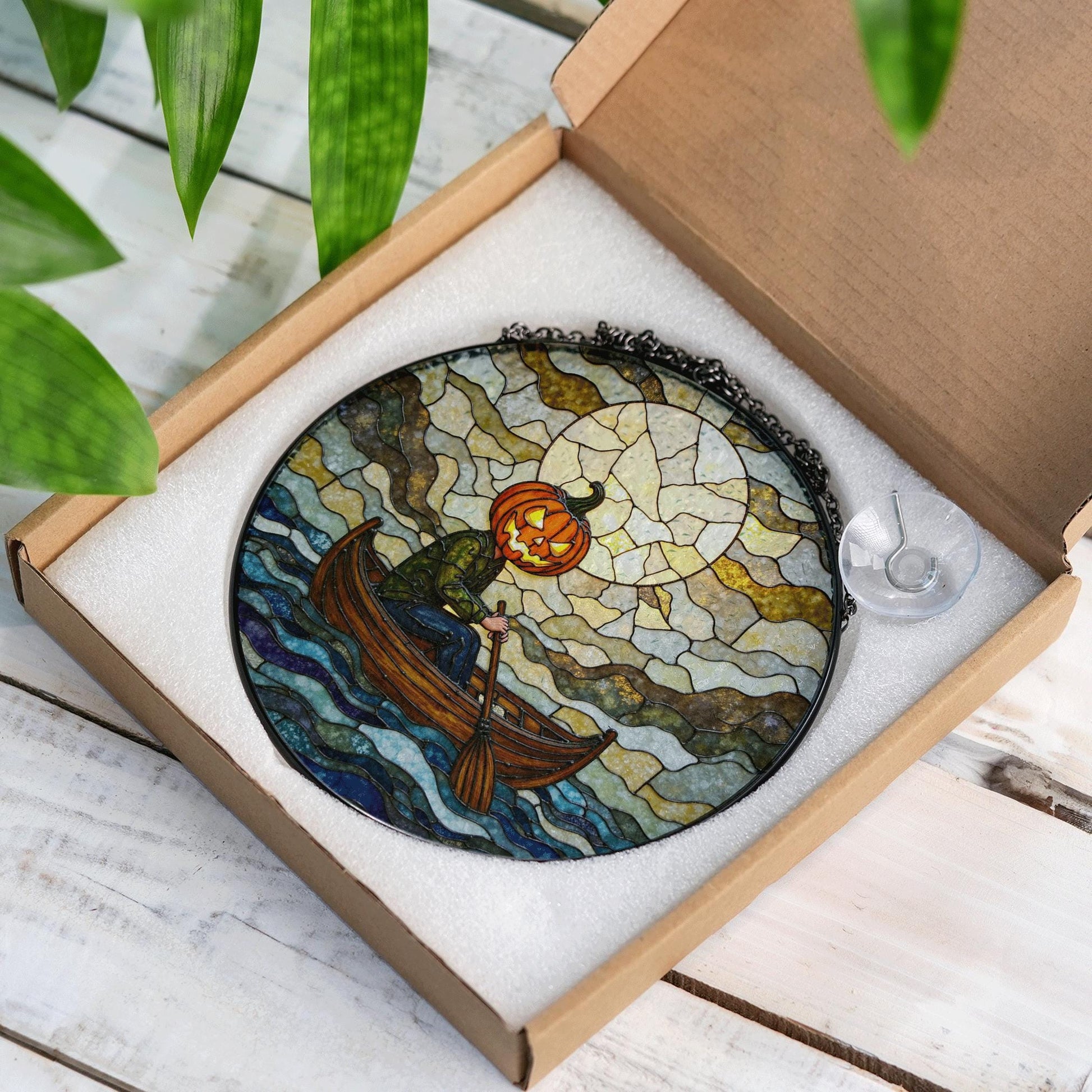 Suncatcher stained glass pumpkin head rowing boat Halloween gift