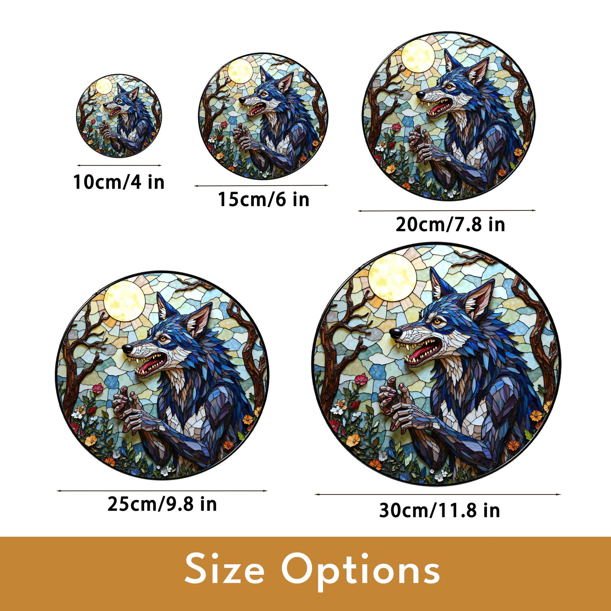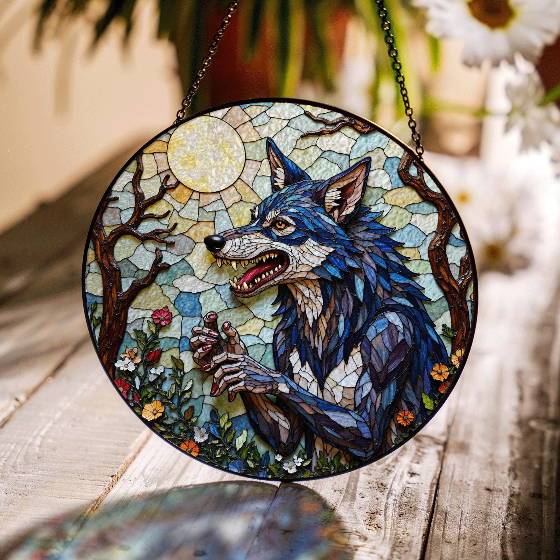 Suncatcher stained glass wolf in moonlit forest Halloween gift