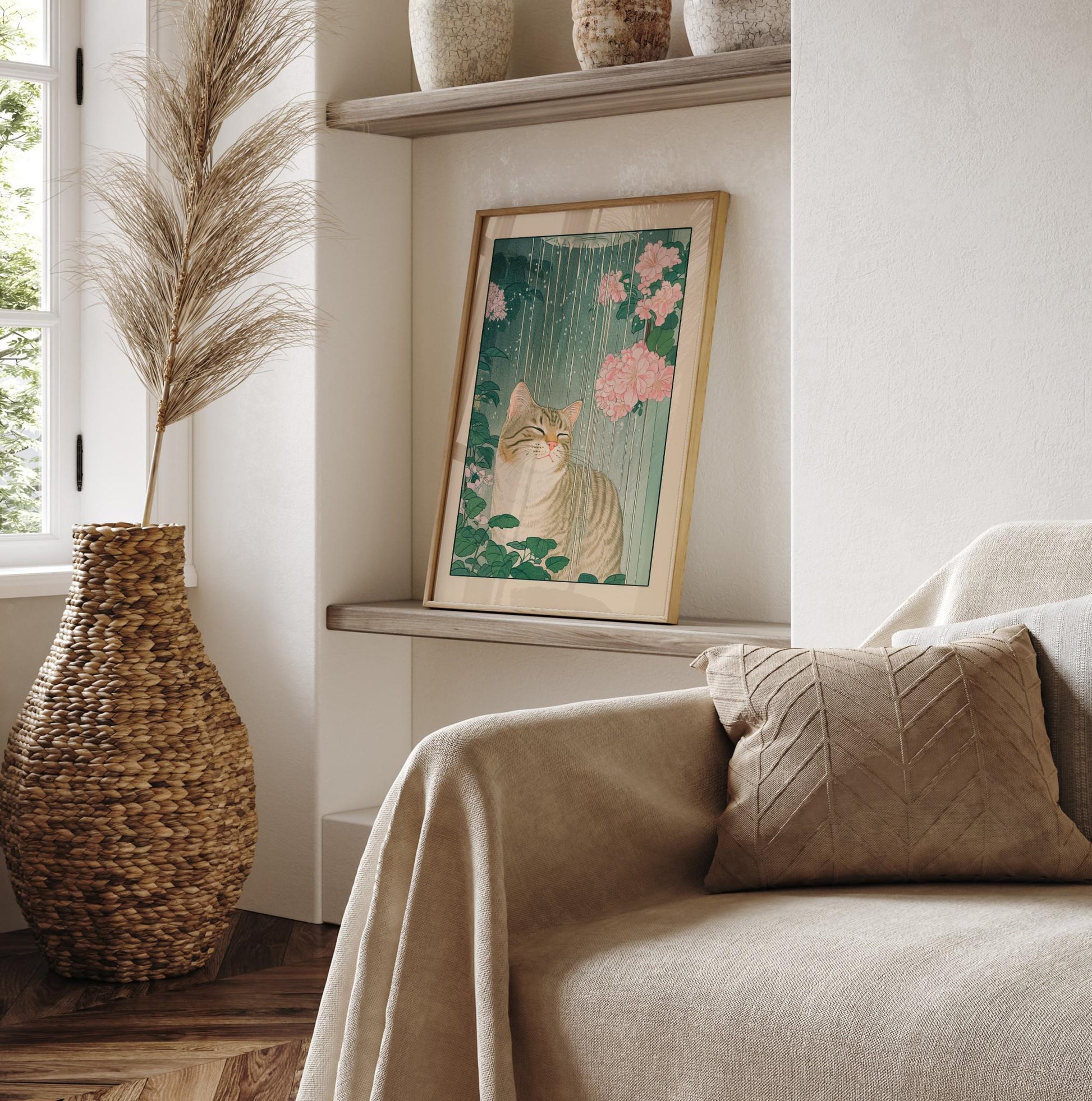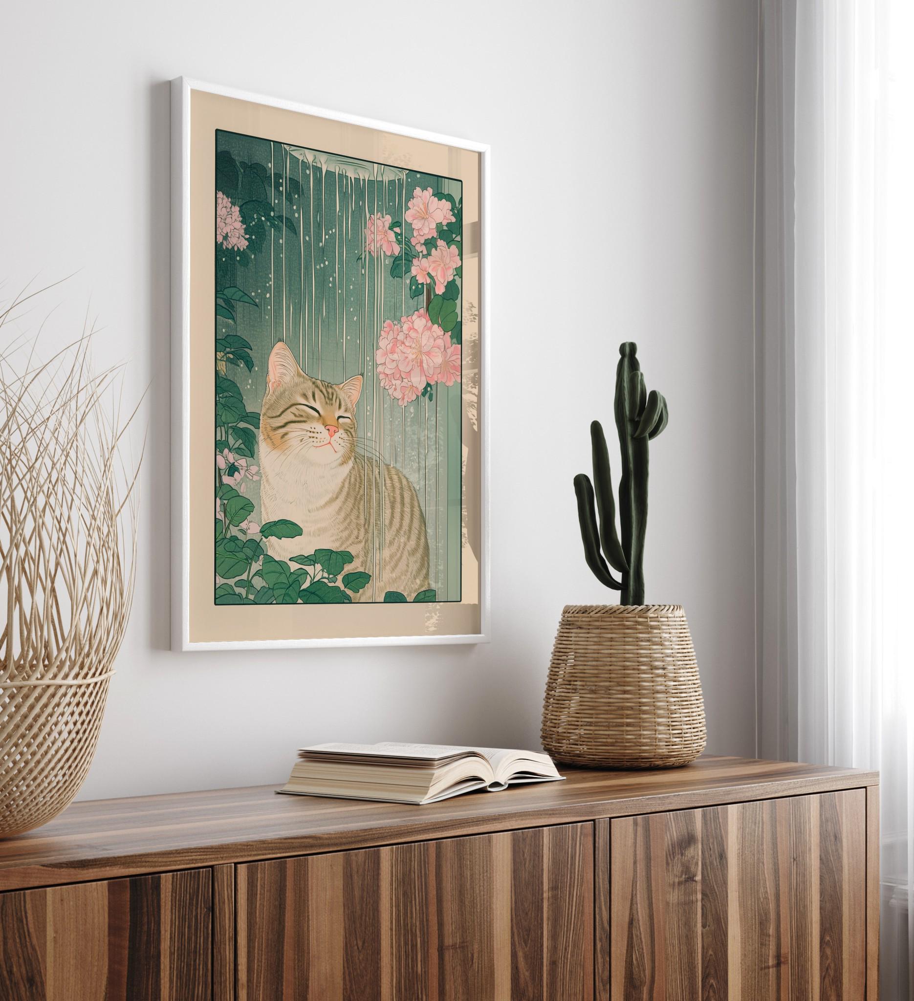 Tabby Cat Shower Print: Ukiyo-e Botanical Bathroom Wall Art