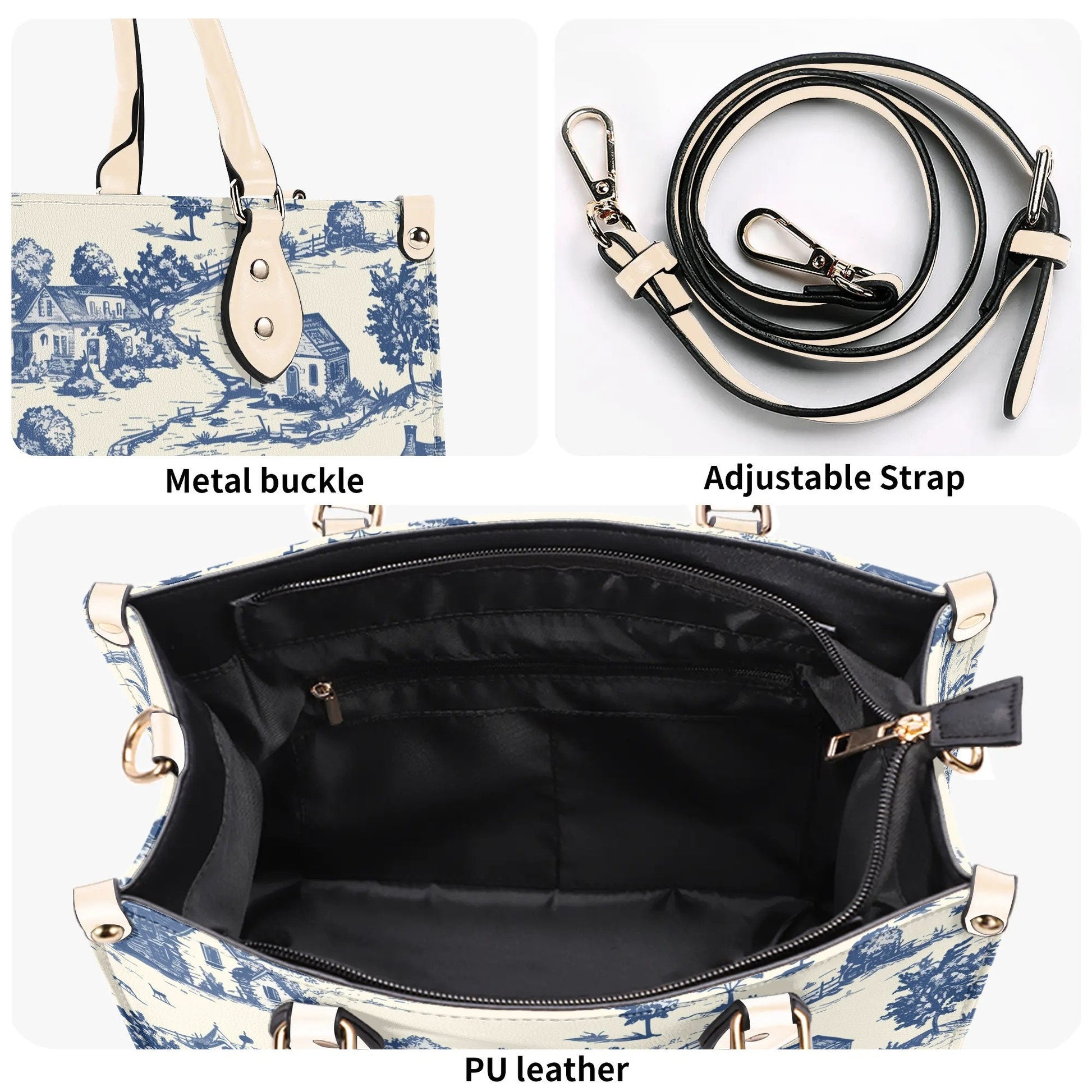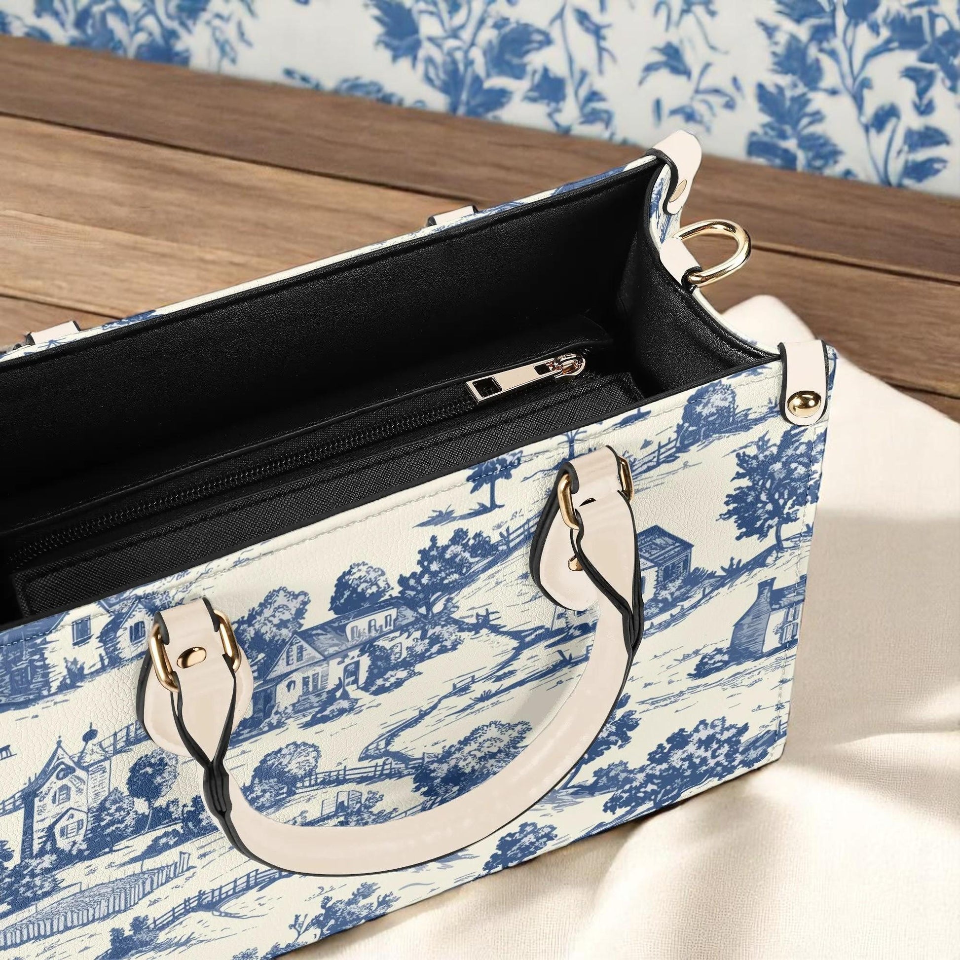 Toile-de-jouy Vintage-Inspired Handbag. Square Tote Bag, Waterproof PU Leather Tote, Top Handle Vegan Leather, Crossbody, Shoulder bag,