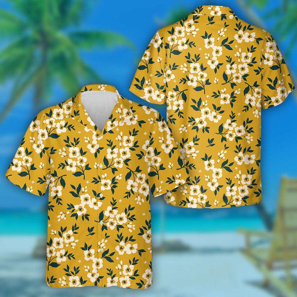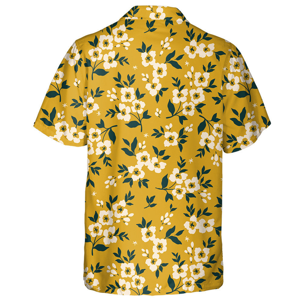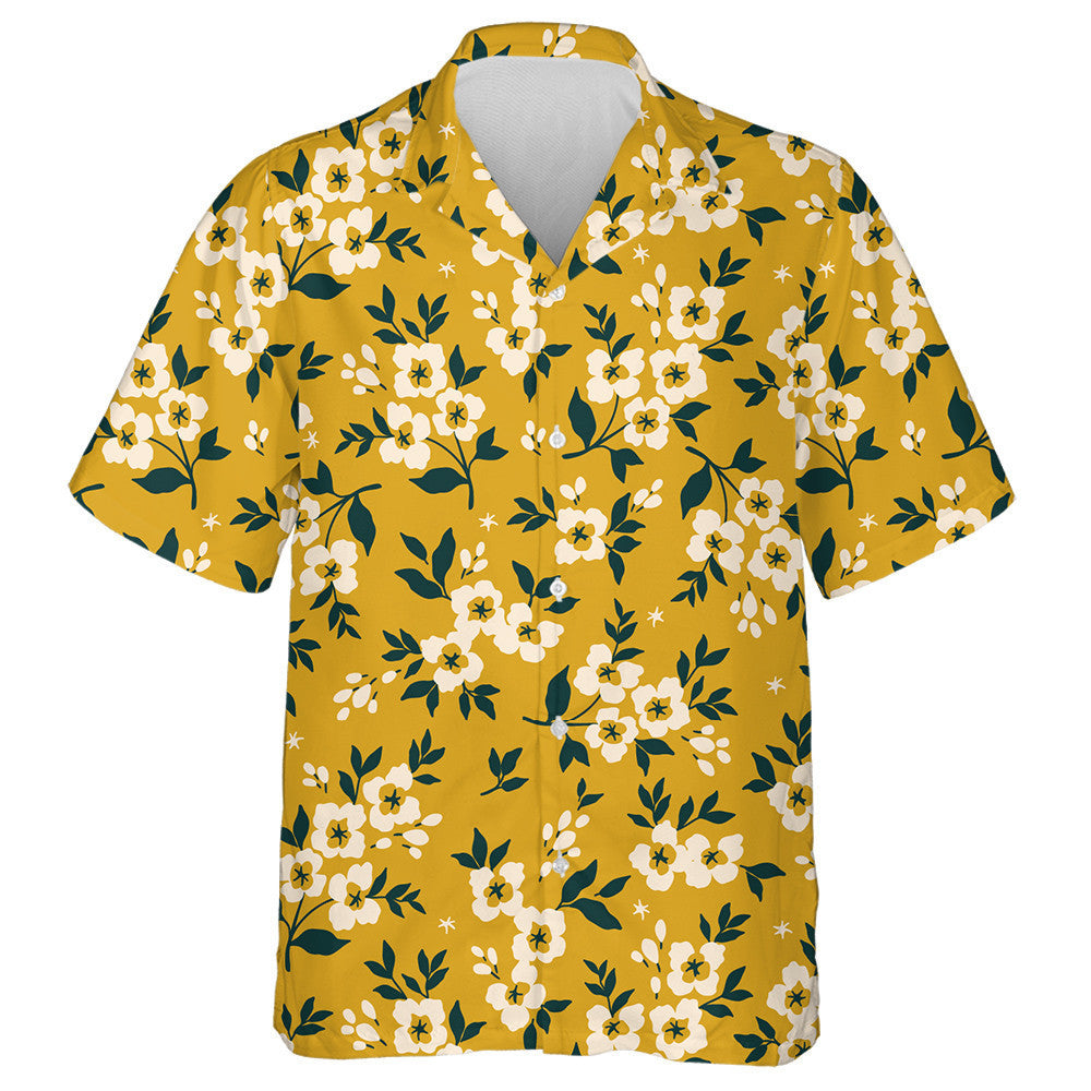 Bláthanna Beaga Trendy Bána Agus Duilleoga ar Chúlra Buí Léine Haváí, Bronntanas Léine Haváís, Bronntanas Nollag
