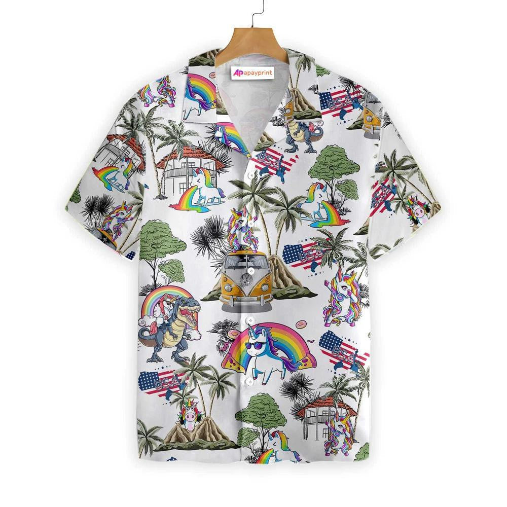 Bratach Mheiriceá Unicorn Ar Phatrún Cúlra Bán Léine Haváís, Bronntanas Léine Haváís, Bronntanas Nollag