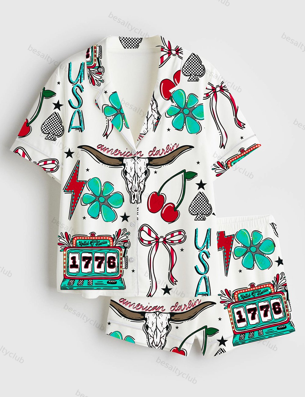 Western 4th Of July Independence Day America Checkers Coquette Patriotic Print Short Sleeve Satin Pajama Set