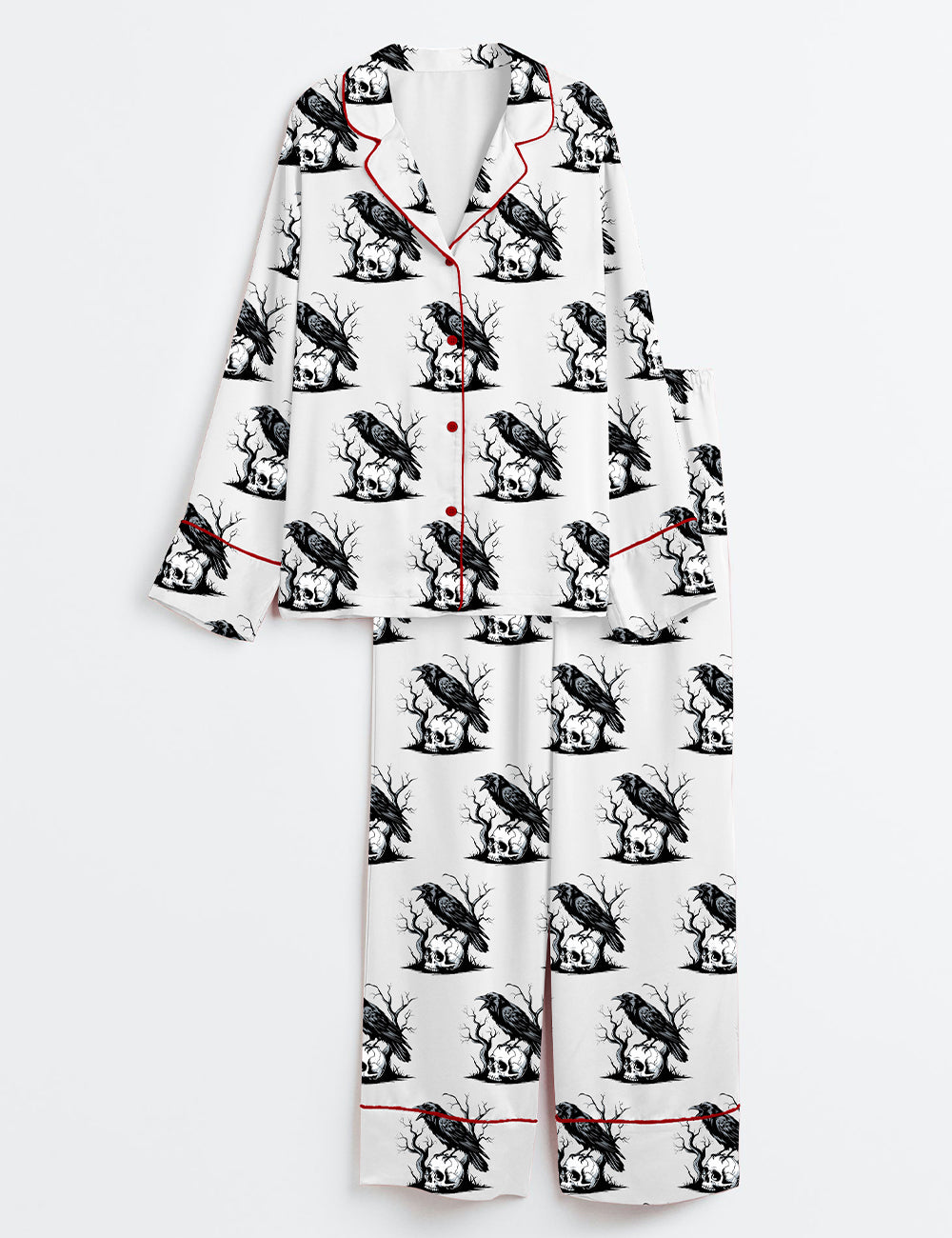 Women’s F-Caw-F Funny Raven Retro Crow Gothic Crow Art Black Crow Long Sleeve Satin Pajama Set