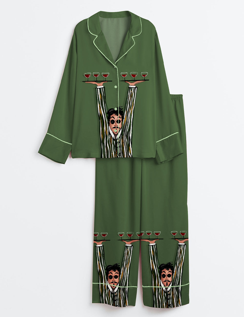 Women’s French Waiter Serving Drinks Long Sleeve Satin Pajama Set