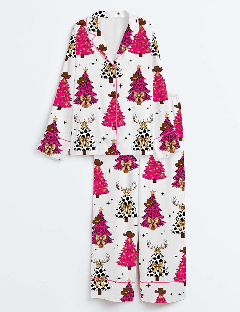 Women’s Howdy Christmas Cowgirl Western Christmas Trees Long Sleeve Satin Pajama Set