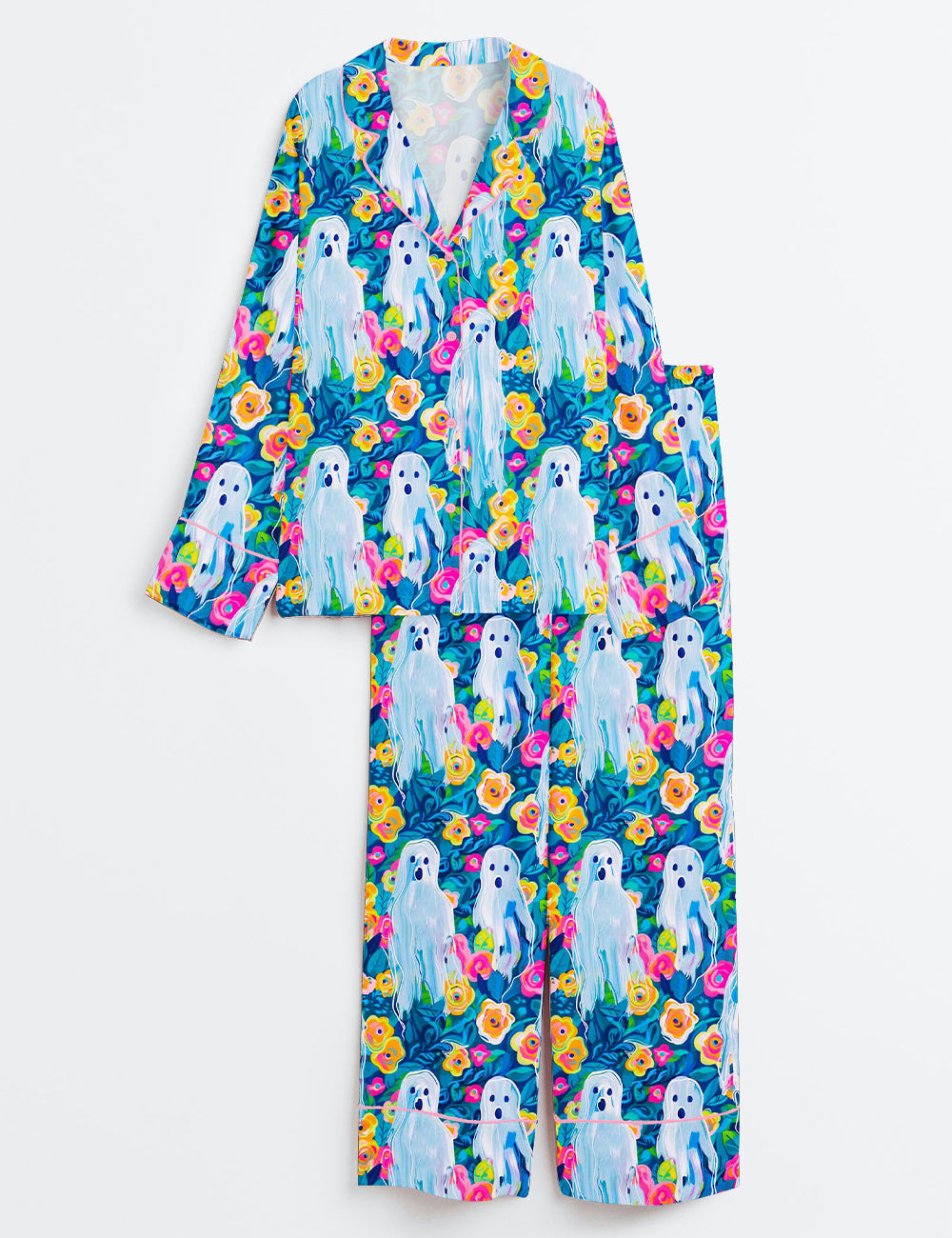 Women’s Preppy Spooky Ghost Fall Floral Halloween Ghost Long Sleeve Satin Pajama Set
