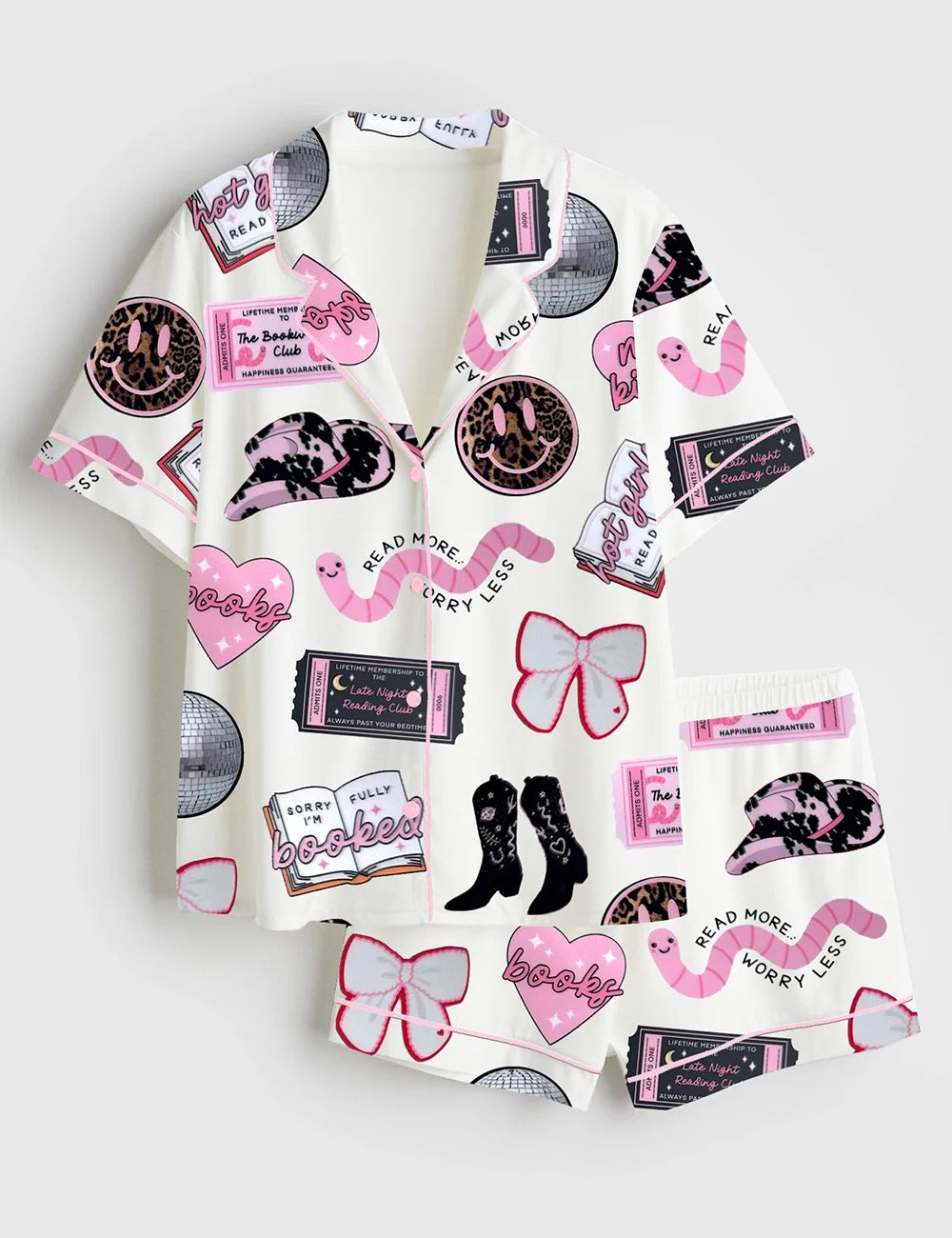 Women's Disco Ball Cherries Smiley Bookworm Long Sleeve Satin Pajama Set