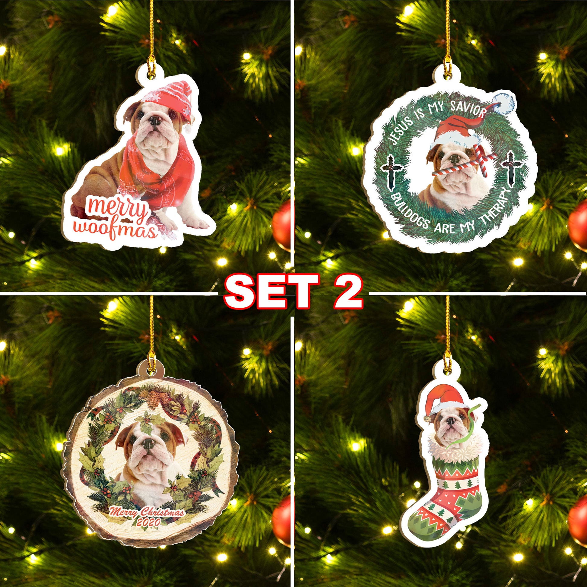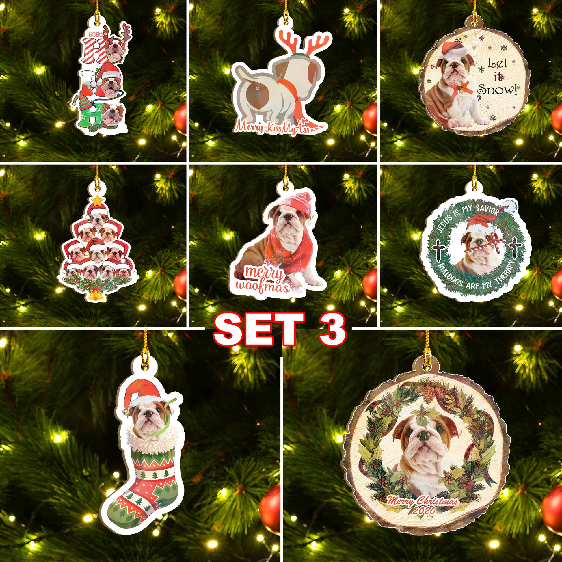 Seit Ornáidí Bulldog na Nollag, Tacar Ornáidí Woofmas Shona, Ornáidí Nollag Greannmhar Smaoineamh Bronntanais Teaghlaigh Do Leannán Madra