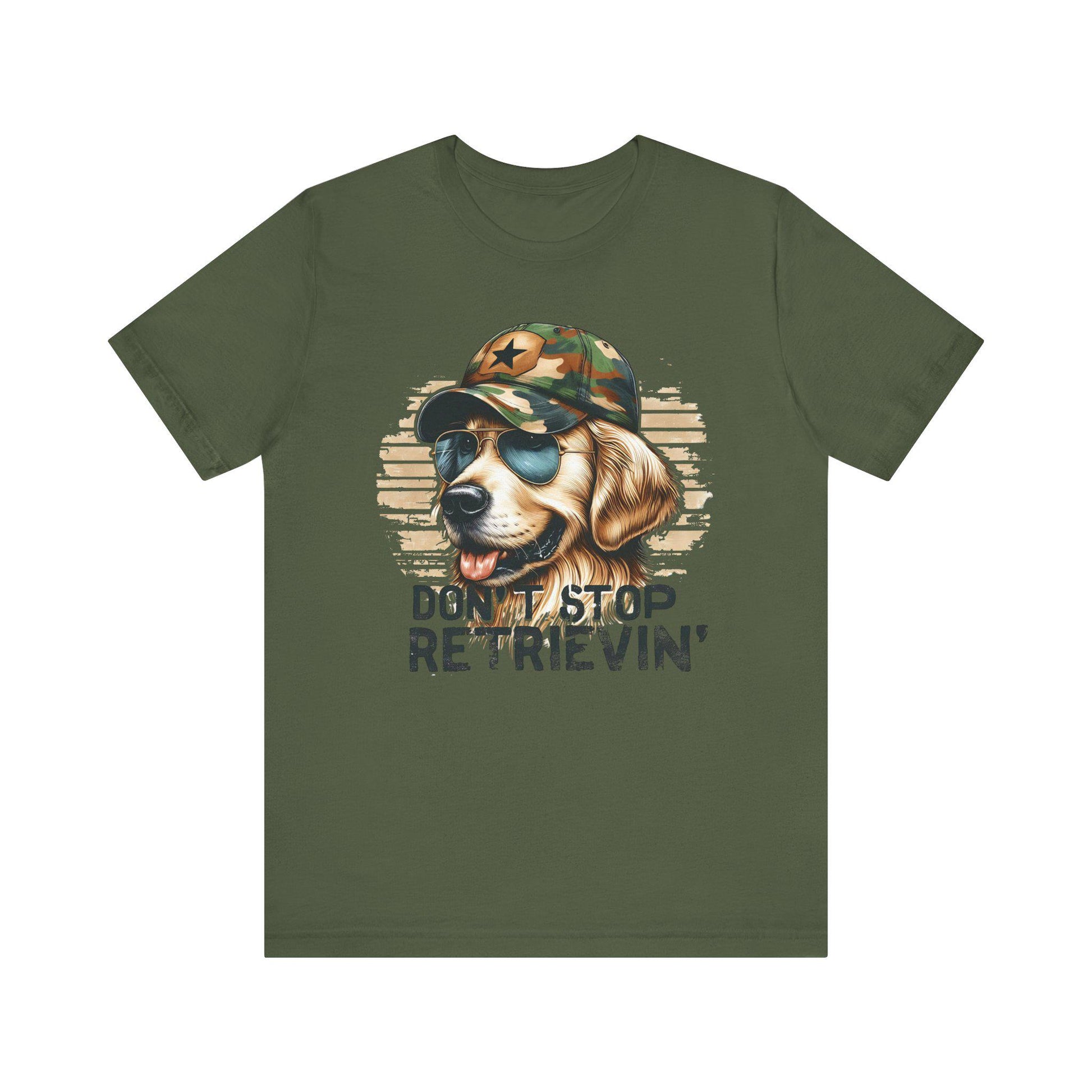 Adult Don't Stop Retrievin' Tee, Fun Golden Retriever Shirt, Gift for Duck Hunter, Golden Retriever Lover, Camo Shirt, Golden Retriever Top