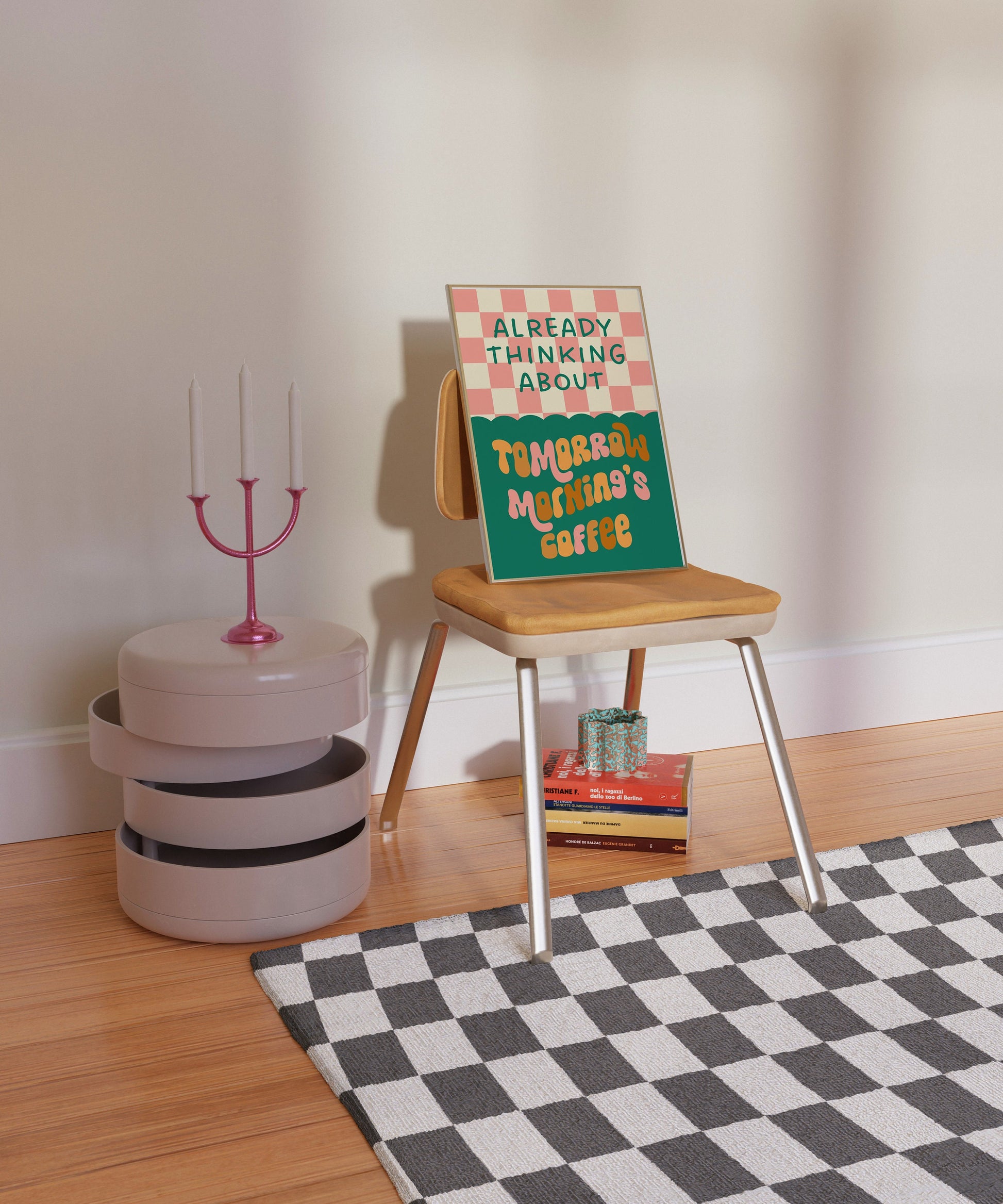 Already Thinking About Tomorrow Morning's Coffee Print - Retro Colourful Kitchen Quote Typography, Funky Bold Modern Trendy Coffee Wall Art