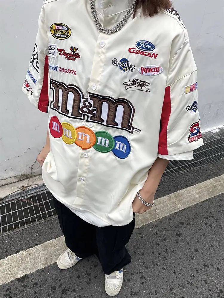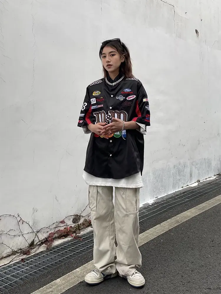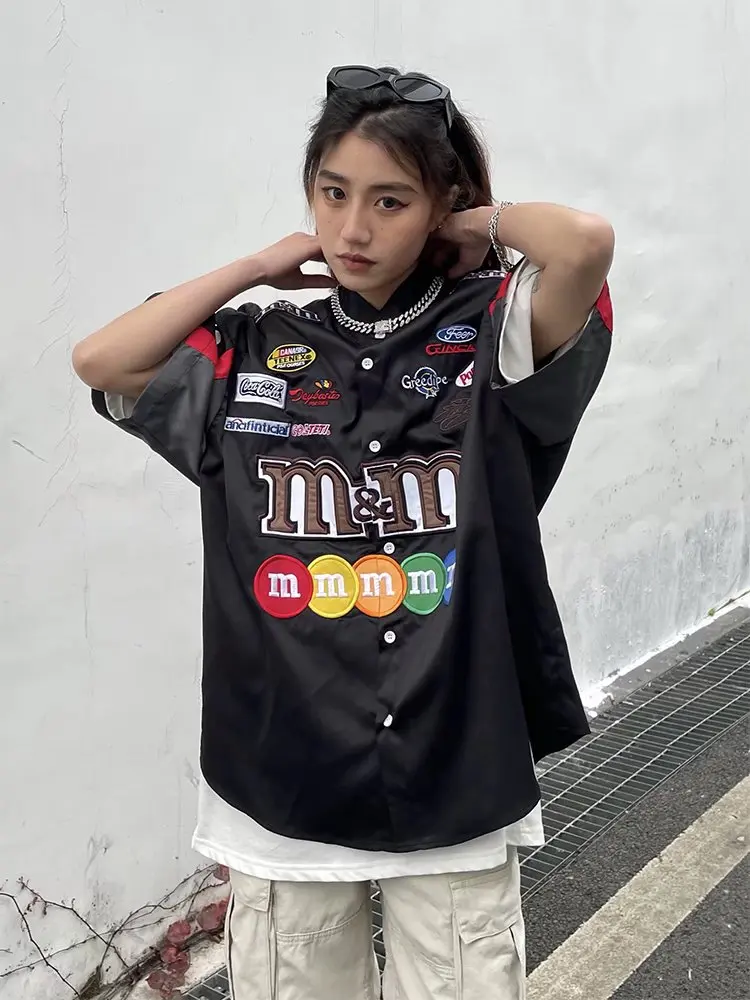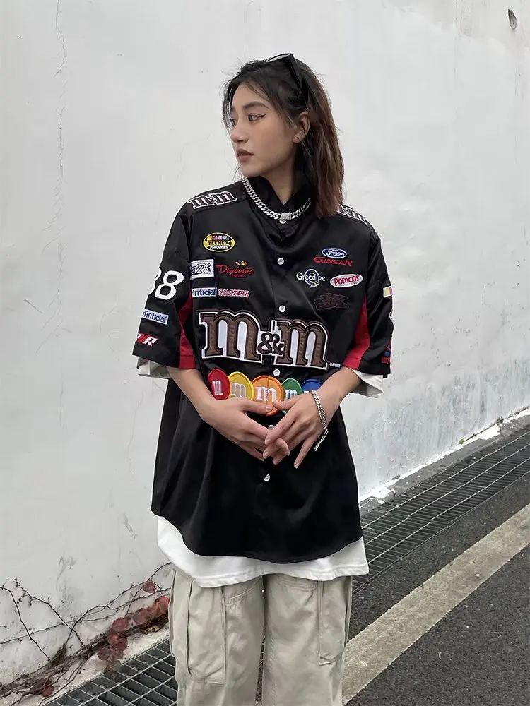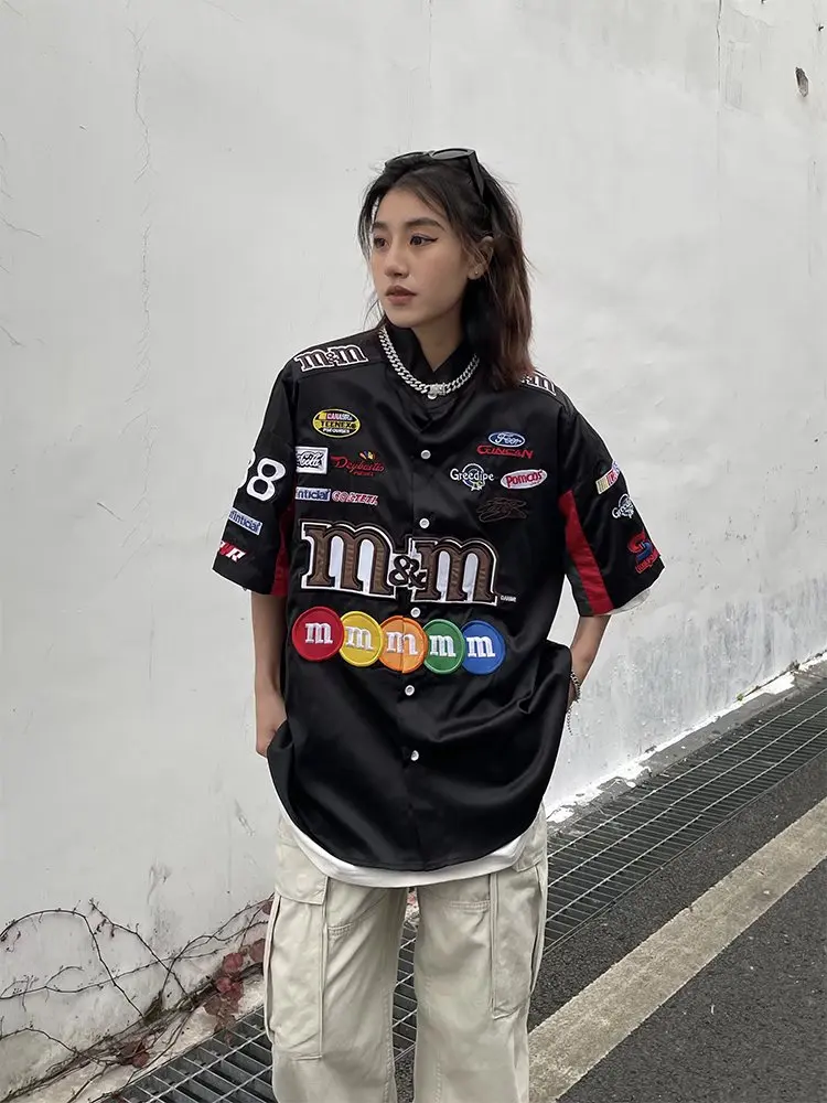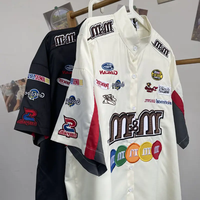 American Retro Embroidery Baseball Shirt Harajuku Hip Hop Short Sleeve Shirts Casual Fashion Uniform Shirt Vintage Streetwear