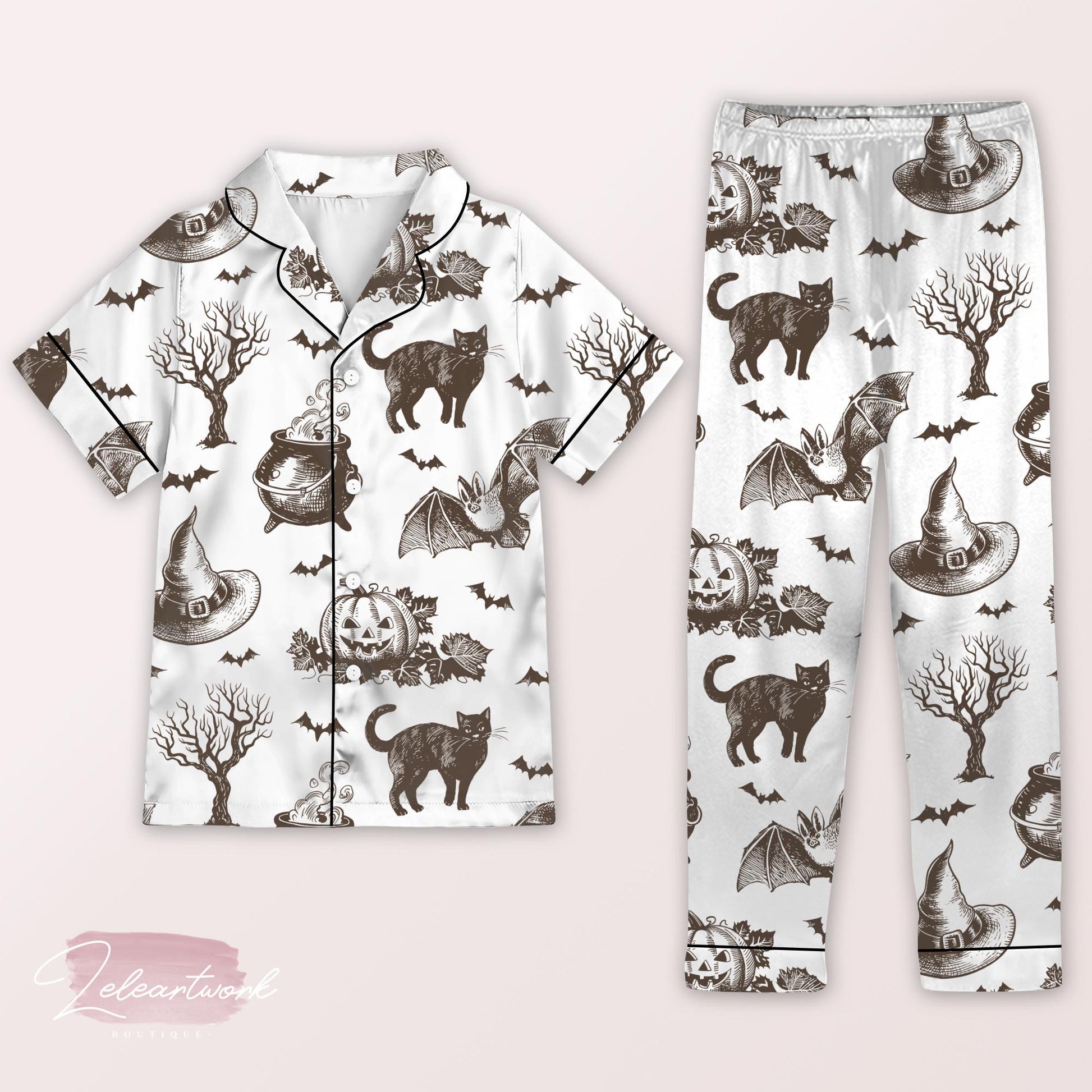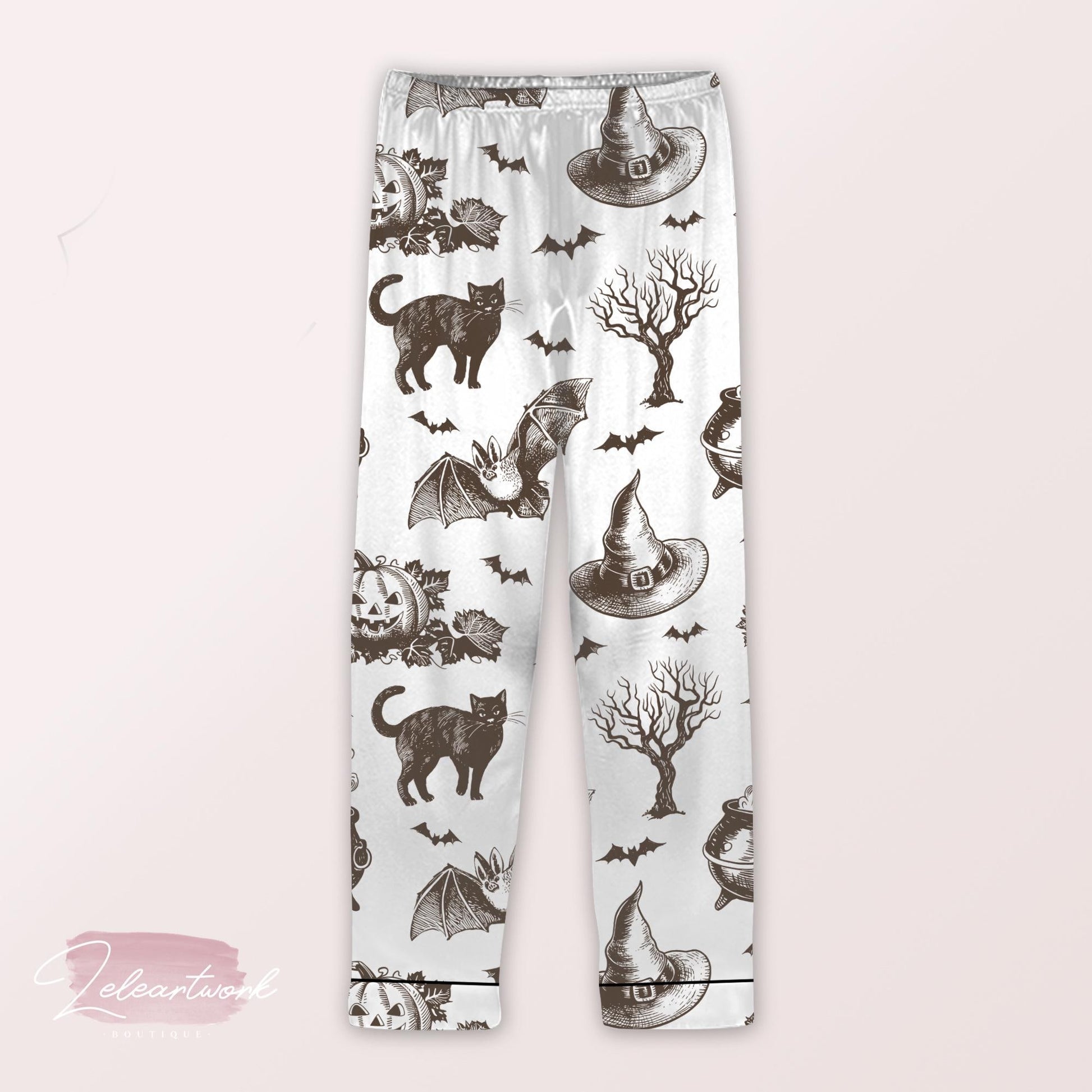 Bewitched Vintage Pajama – Retro Halloween Cat, Cauldron & Pumpkin Print Sleep Set | Spooky Autumn Loungewear for Women