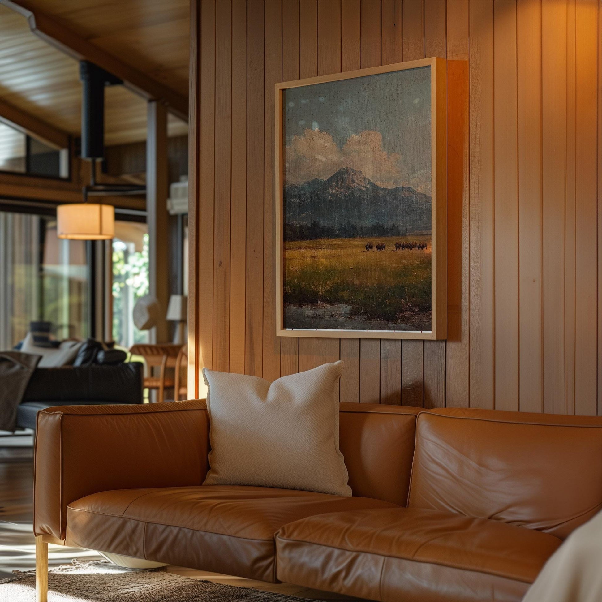 Bison Grazing in a Field Vintage Oil Painting Print Rustic Antique Retro Buffalo Print Rocky Mountain Poster Western Cabin Cottage Wall Art