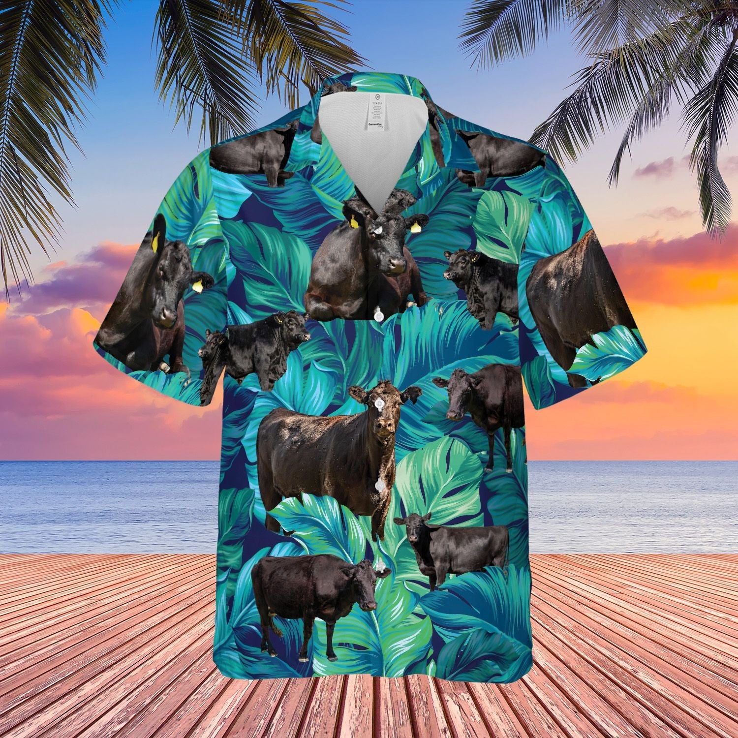 Black Angus Cattle Blue And Green Background Hawaiian Shirt, Hawaiian Shirt Gift, Christmas Gift
