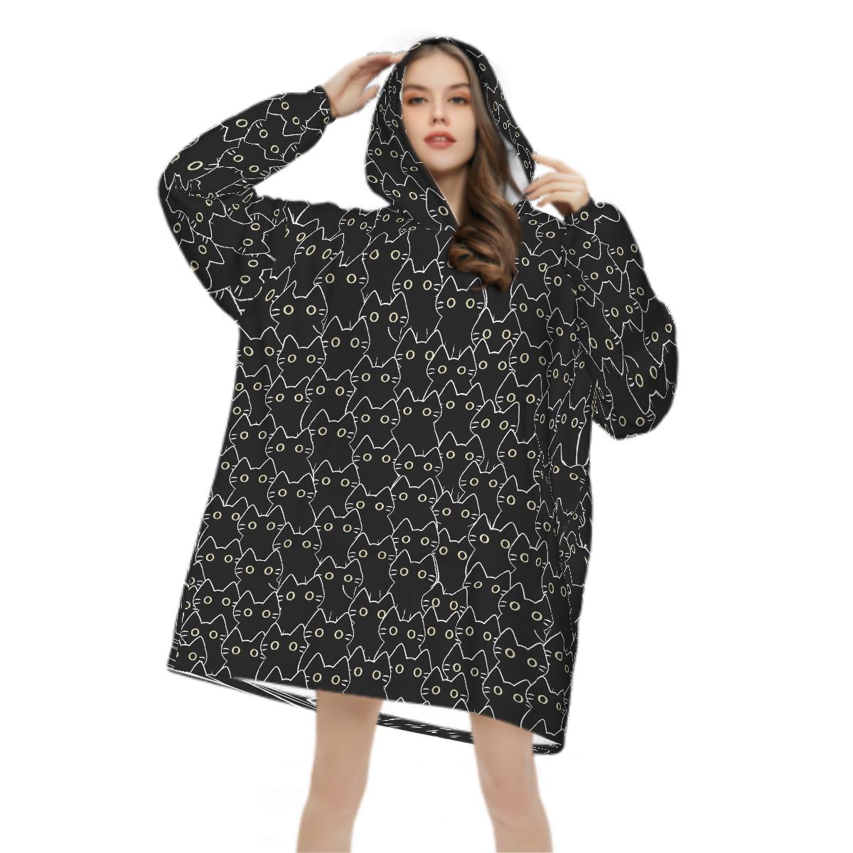 Black Cat Blanket Hoodie, Boho Witchy Black Hooded Jumper, Kawaii Anime Cute Winter Fall Accessory