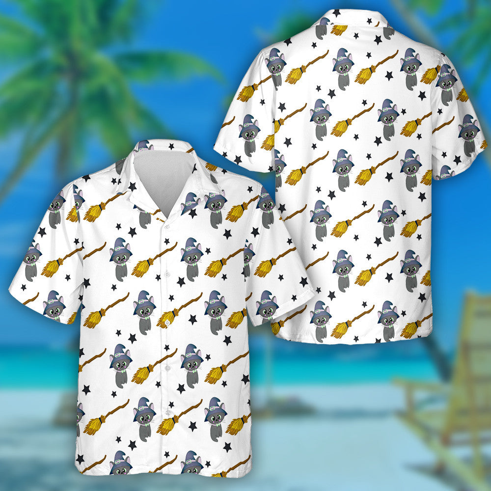 Black Cat With Broom For Flying Magic Items Hawaiian Shirt, Hawaiian Shirt Gift, Christmas Gift