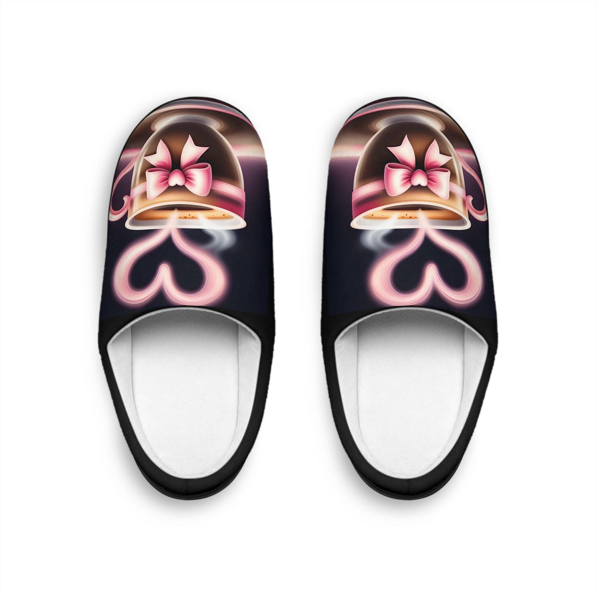 Blackand Pink Slippers Cute PinkBow Mini Coffee Cup Women's Indoor Shoes, Cozy House Footwear, Warm House Slides, Soft Bedroom Slippers