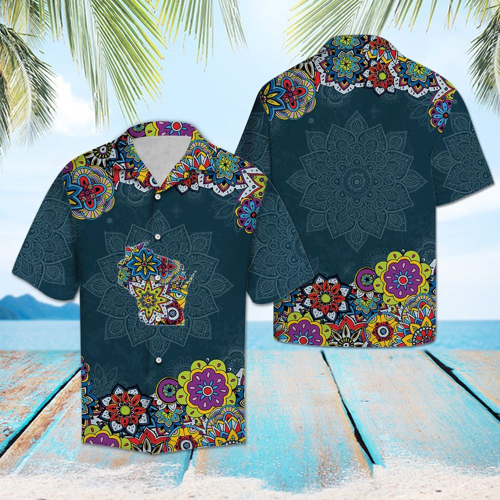 Blue Background Wisconsin Mandala Flower Patchwork Pattern Hawaiian Shirt, Hawaiian Shirt Gift, Christmas Gift
