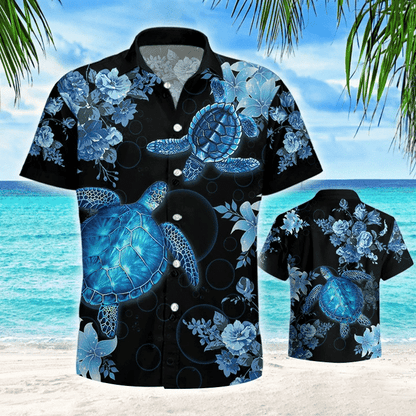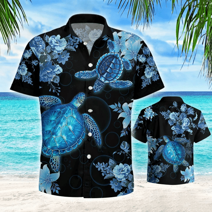 Blue Sea Turtle Black Theme Nice Design Hawaiian Shirt, Hawaiian Shirt Gift, Christmas Gift