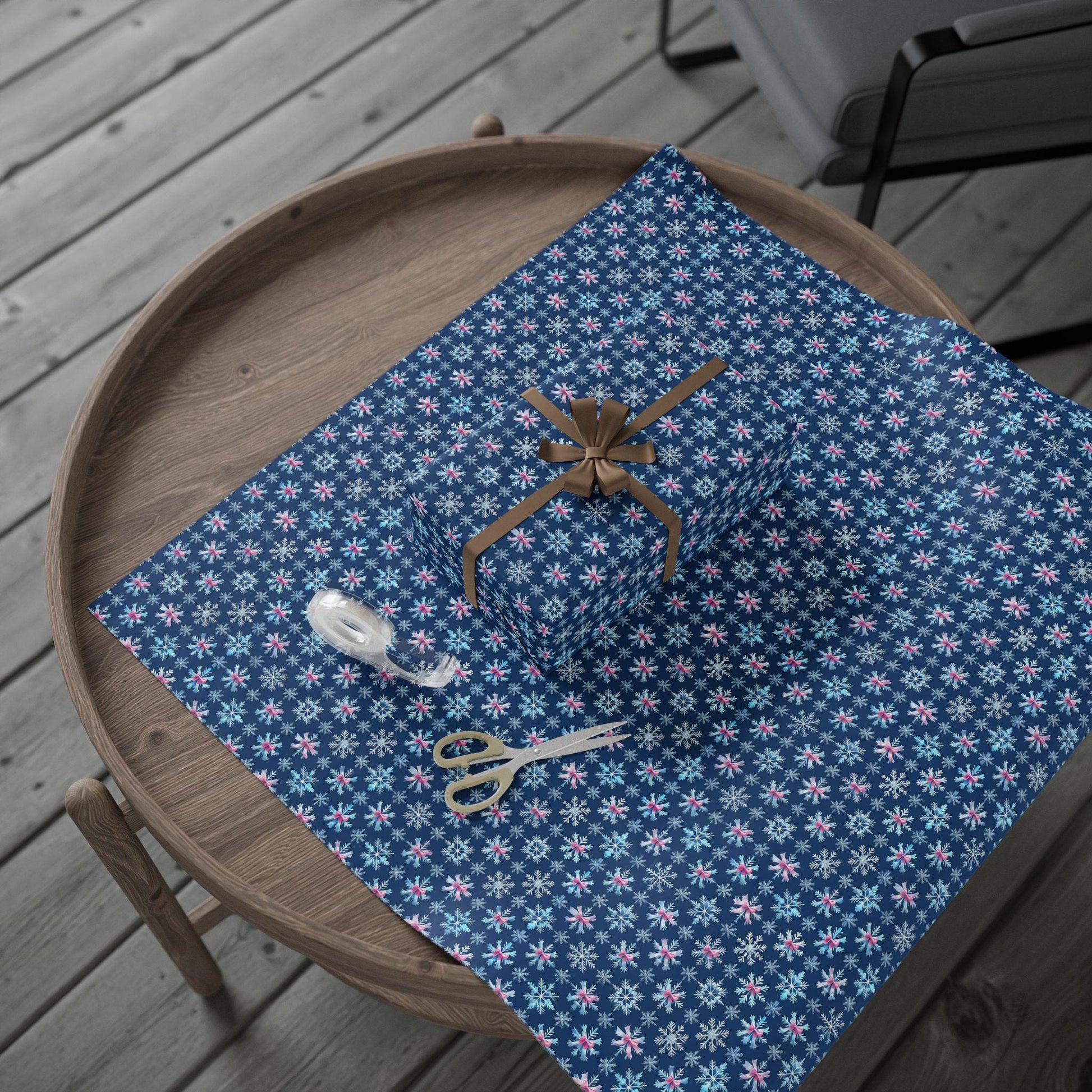Blue Snowflake Pink Bows Wrapping Paper, Winter Holiday Gift Wrap, Christmas Present Wrap, Seasonal Party Packaging Paper Sheets