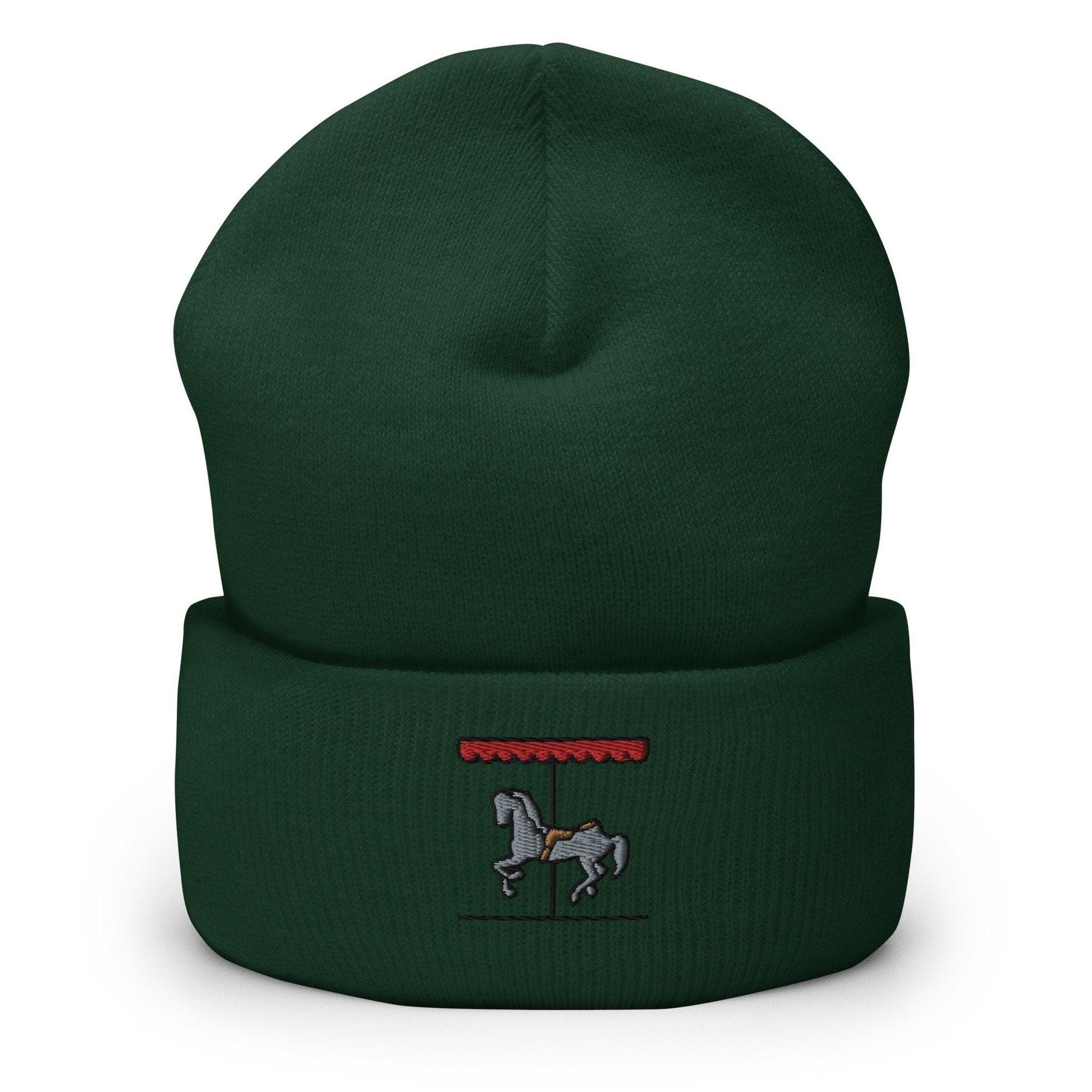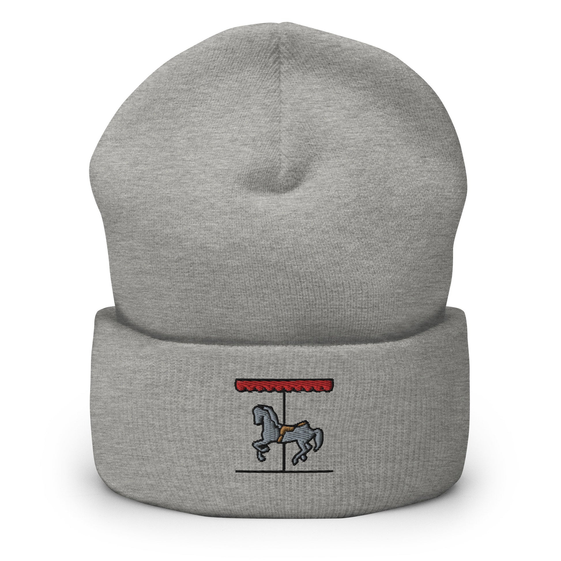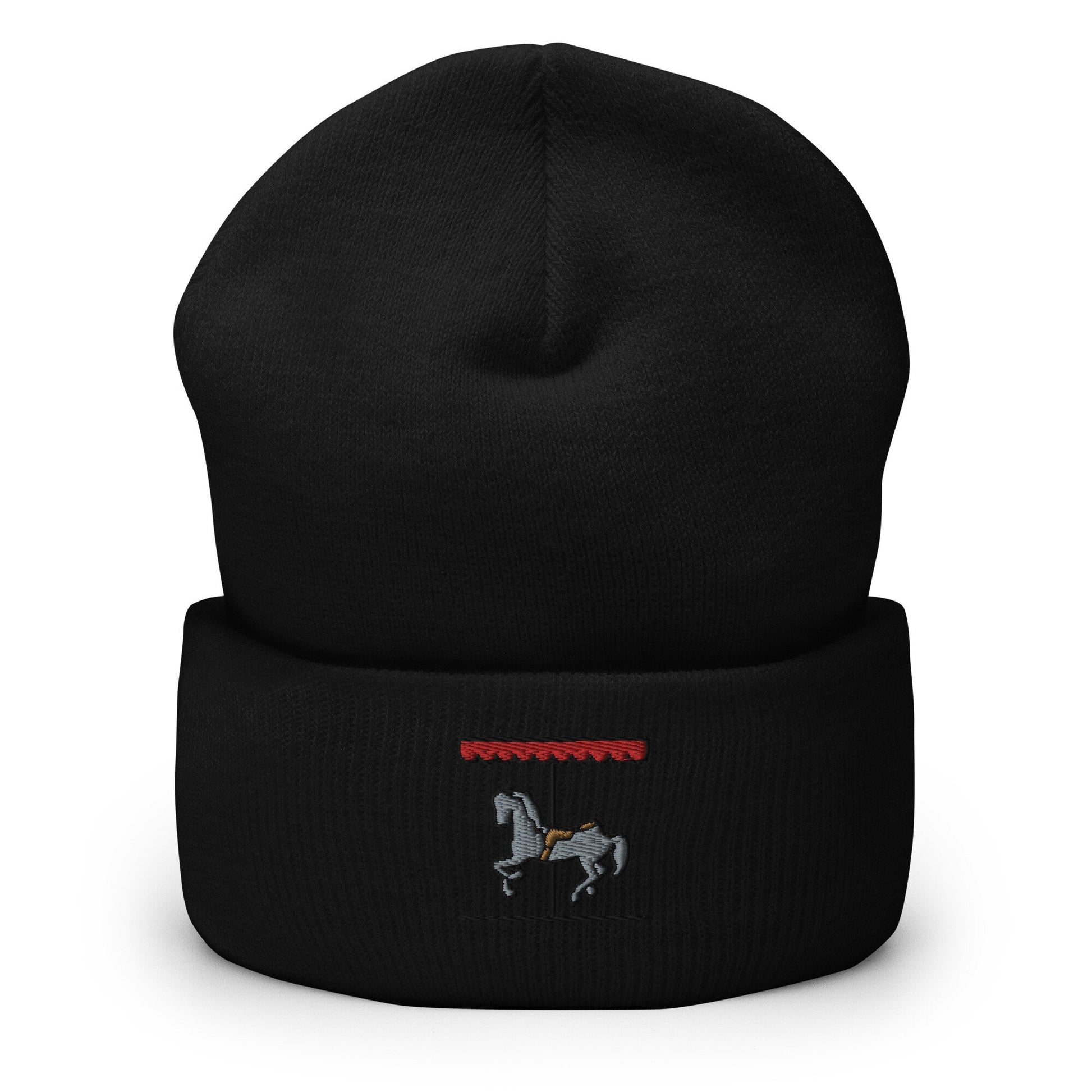 Carousel Merry Go Round Carnival Ride Embroidered Beanie, Handmade Cuffed Knit Unisex Slouchy Adult Winter Hat Cap Gift