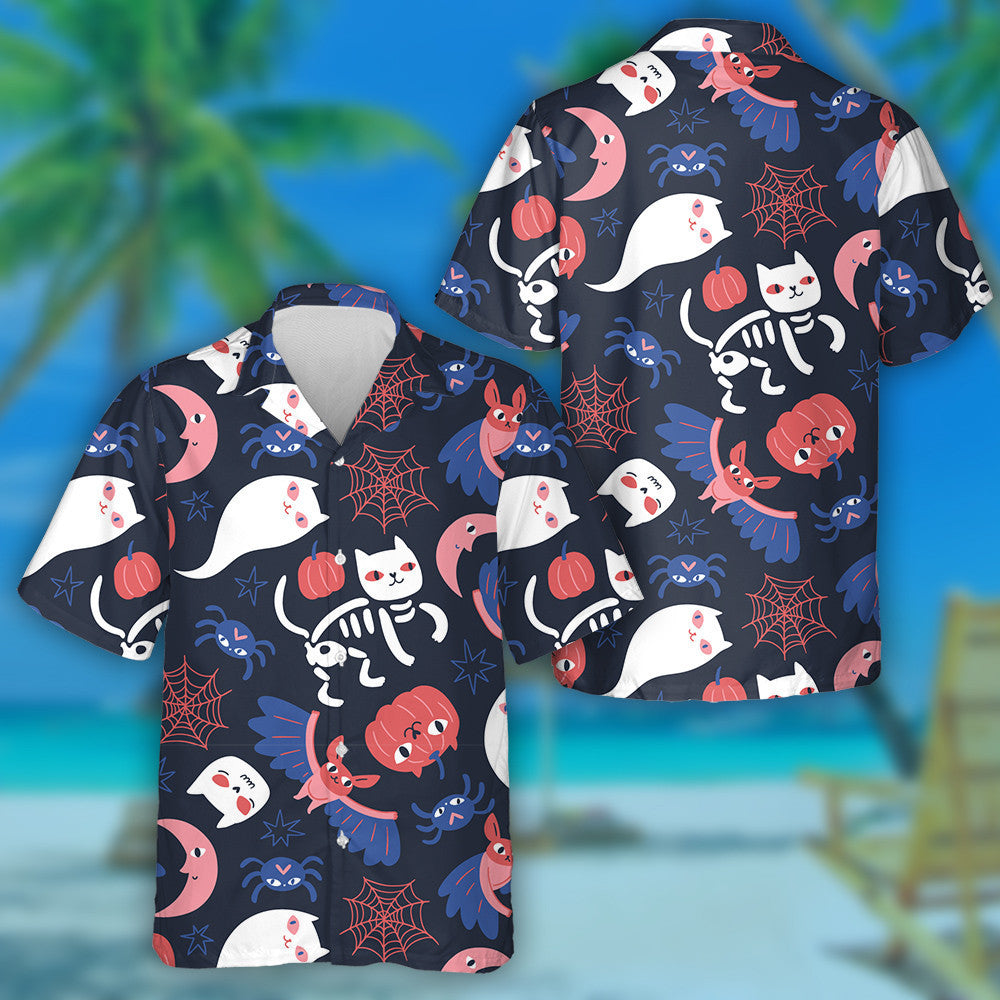 Cats And Ghosts On Navy Blue Background Hawaiian Shirt, Hawaiian Shirt Gift, Christmas Gift