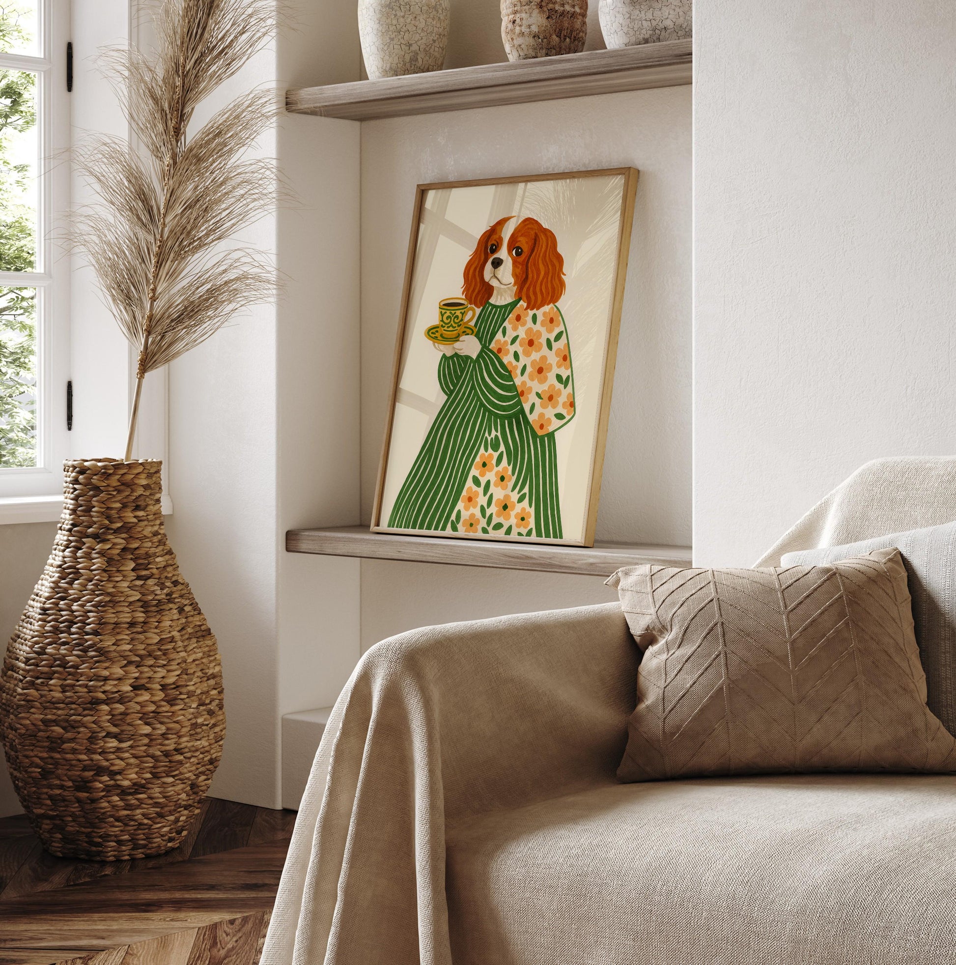 Cavalier King Charles Spaniel Art Print: Dog with Coffee & Flowers