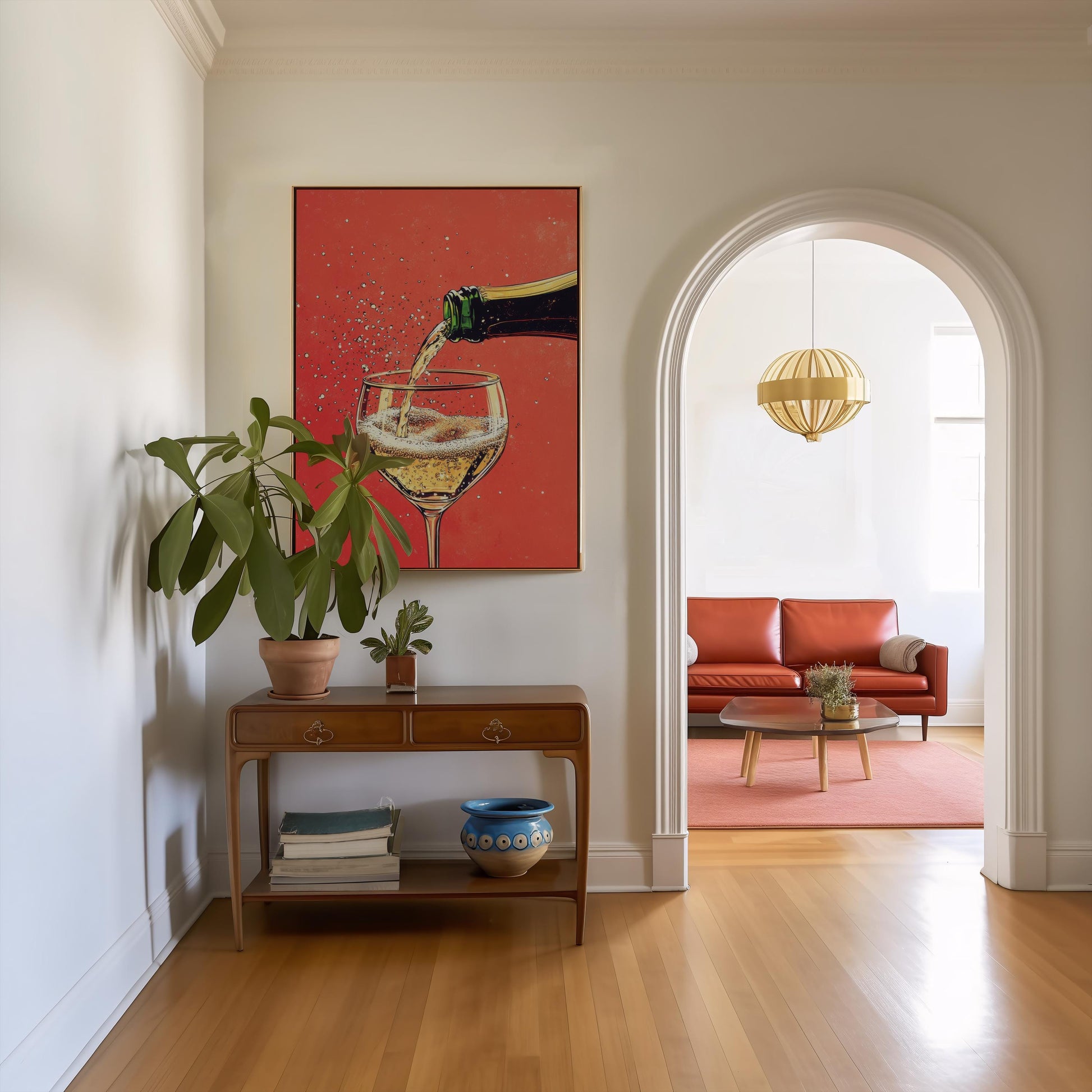 Champagne Coupe Glass Print: Gold Rim, Red Orange Bar Cart Art