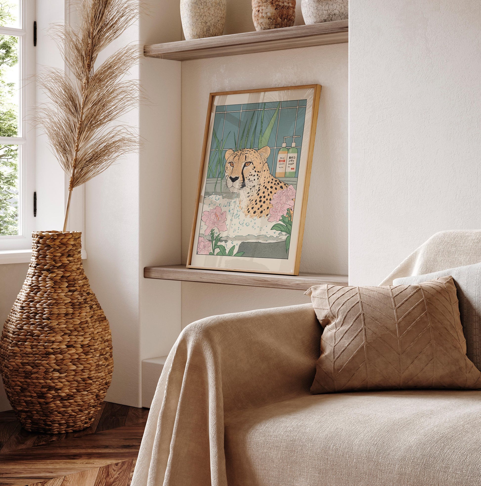 Cheetah in Bathtub Art Print: Japanese Ukiyo-e Style Bathroom Decor