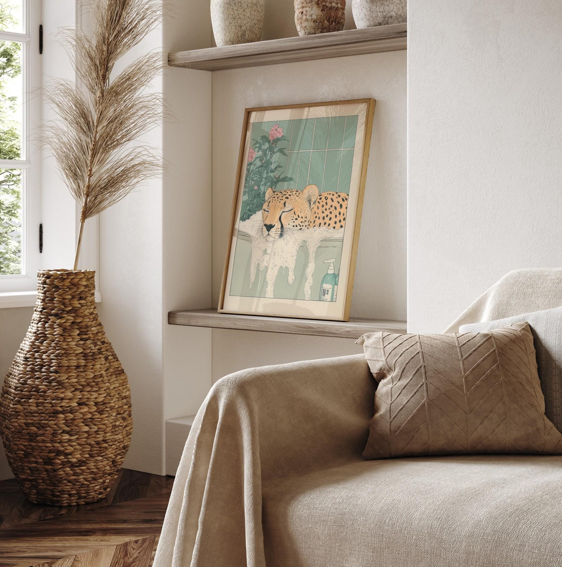 Cheetah in Bathtub Ukiyo-e Print: Funny Japandi Bathroom Art