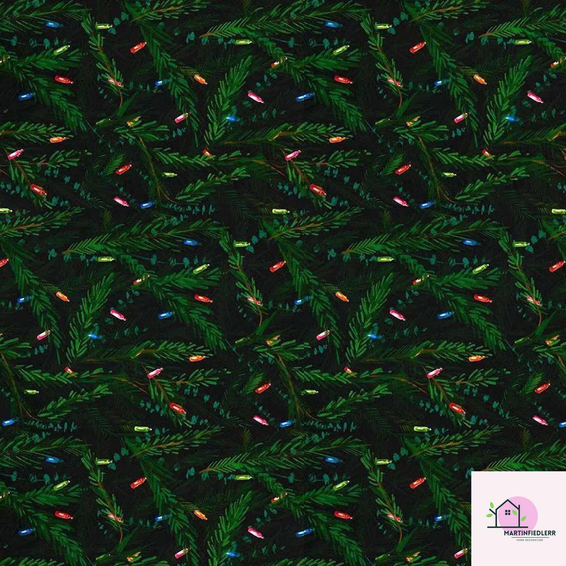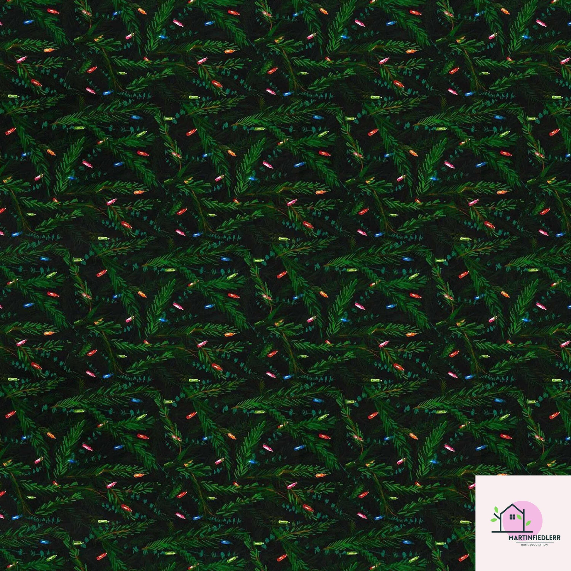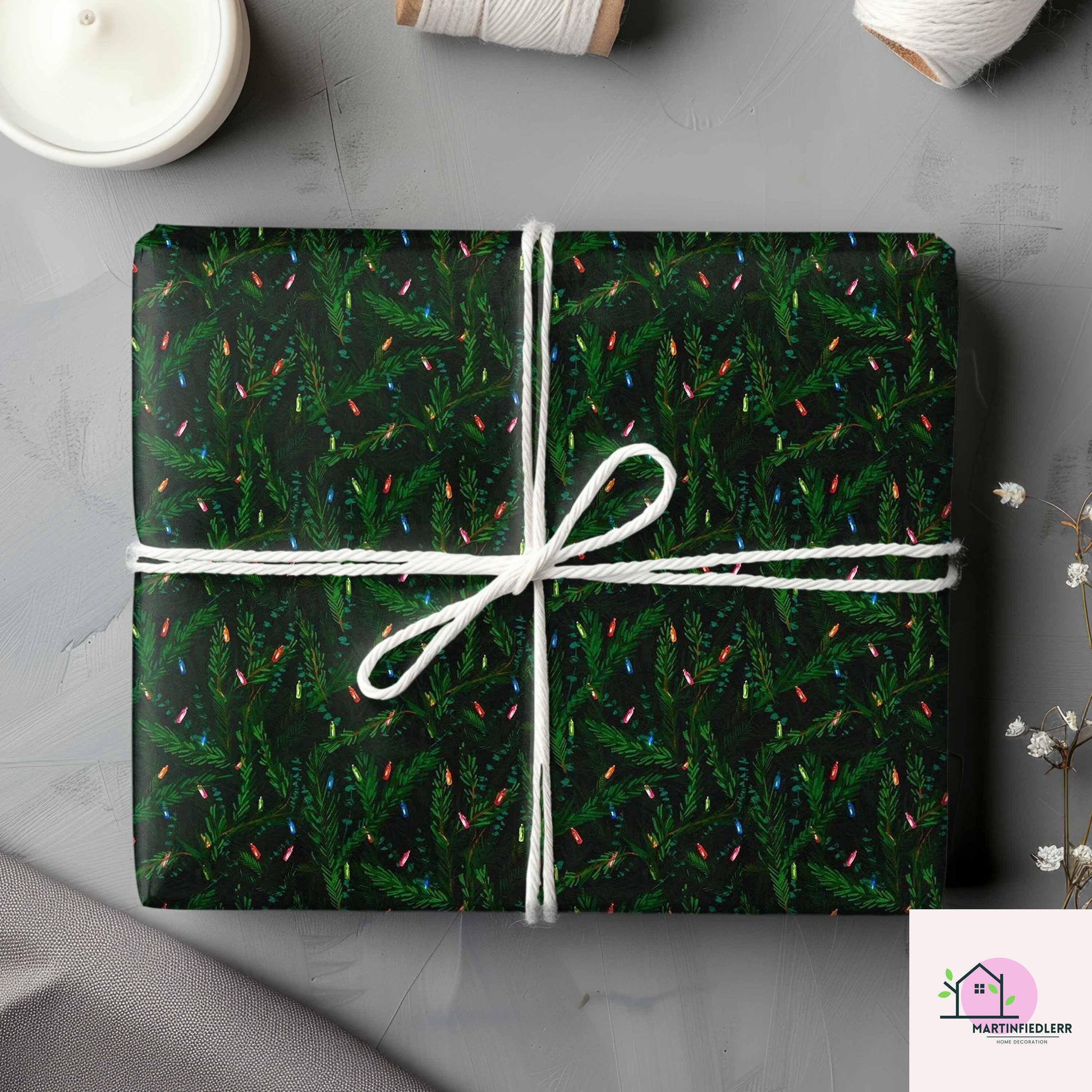Christmas Lights Wrapping Paper, Black Evergreen Holiday Gift Wrap Sheets, Festive Pine Branch Xmas Packaging, Dark Night Winter Party Style