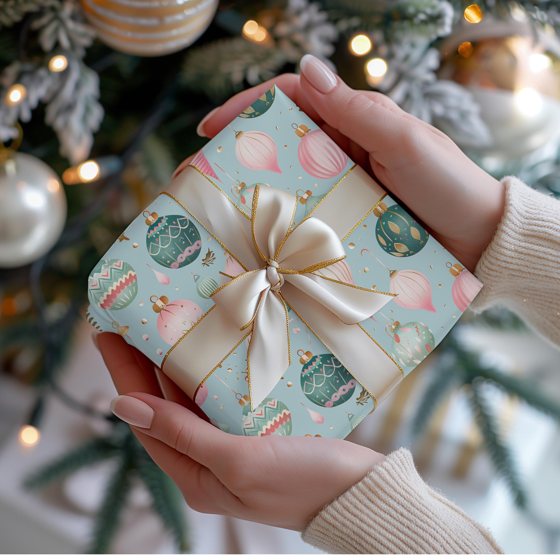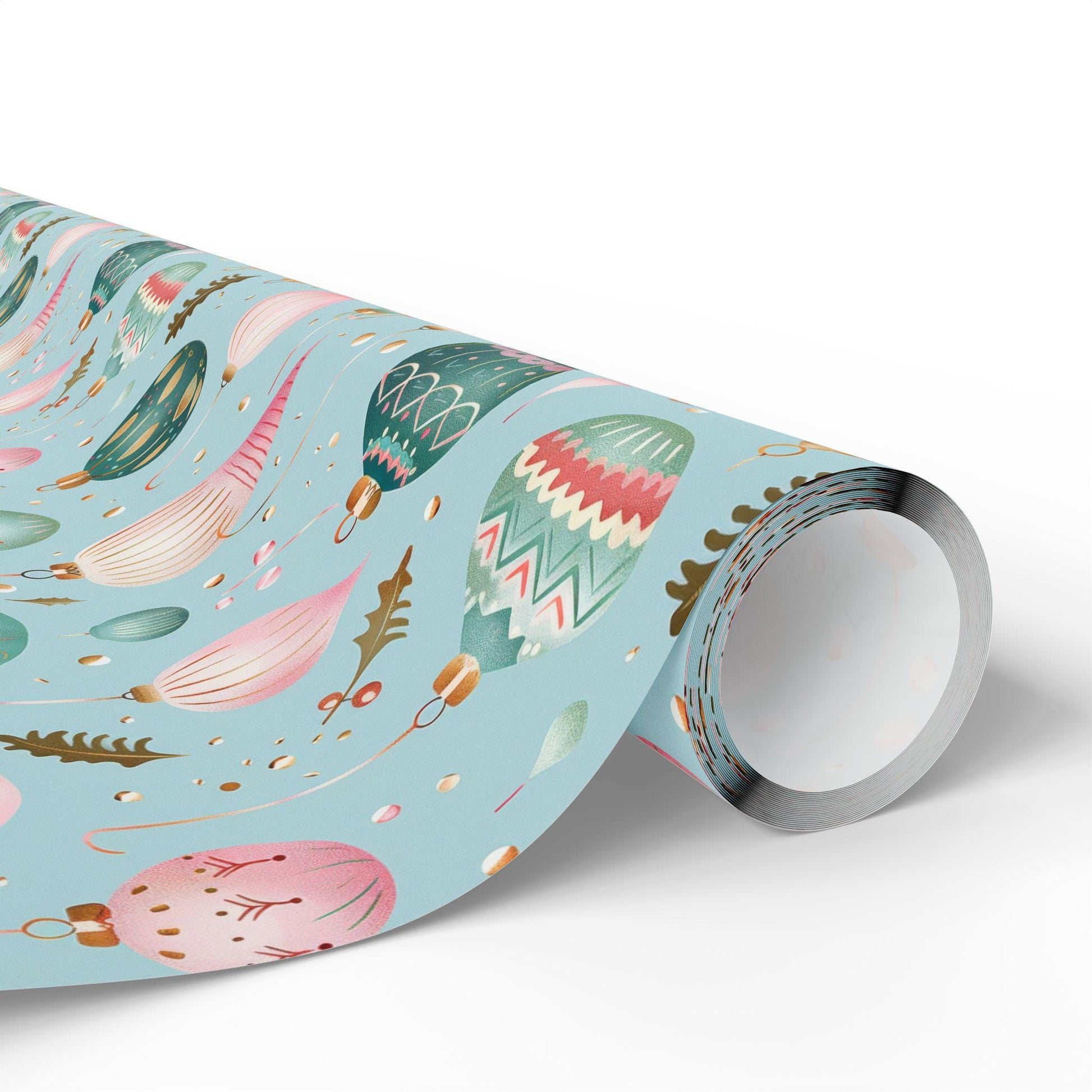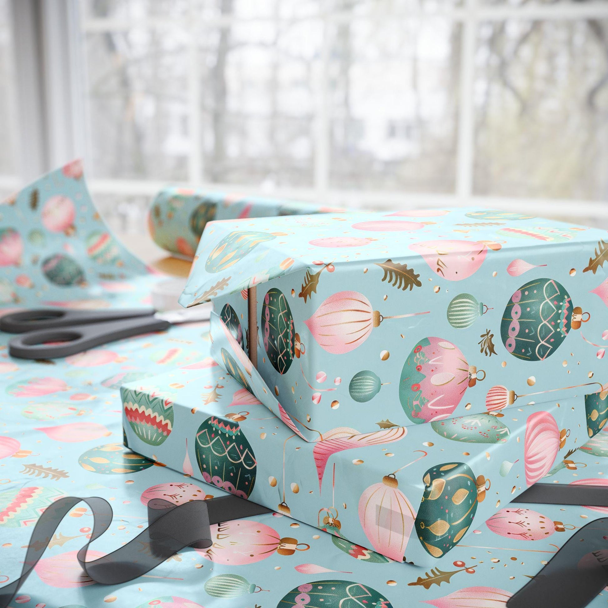 Christmas Wrapping Papers, Holiday Gift Wrap, Festive Vintage Ornaments, Pink & Green Xmas Design, Holiday Wrapping Paper Set