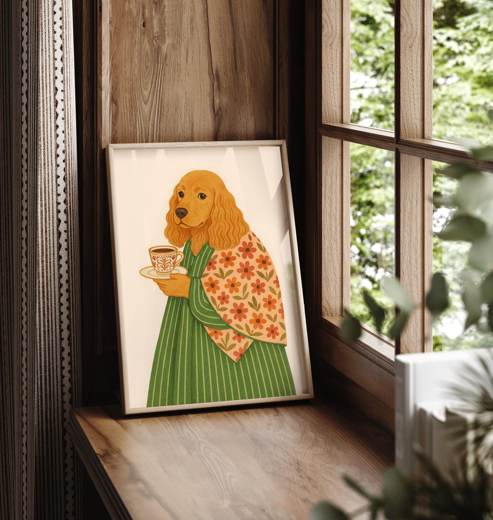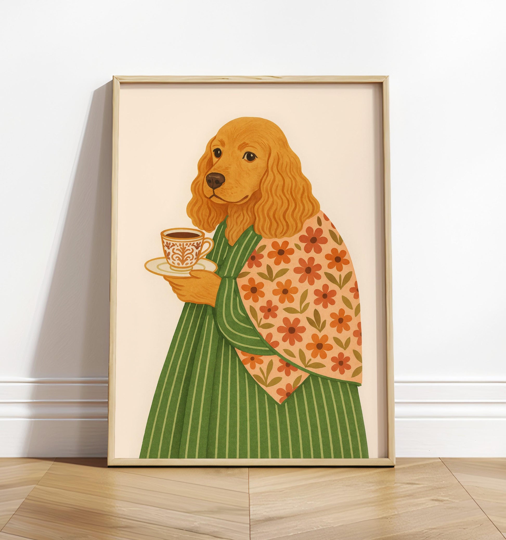 Cocker Spaniel print, Dog with coffee, Coffee wall art, Espresso art print, Floral pattern print, Beige neutral aesthetic poster, Dog art
