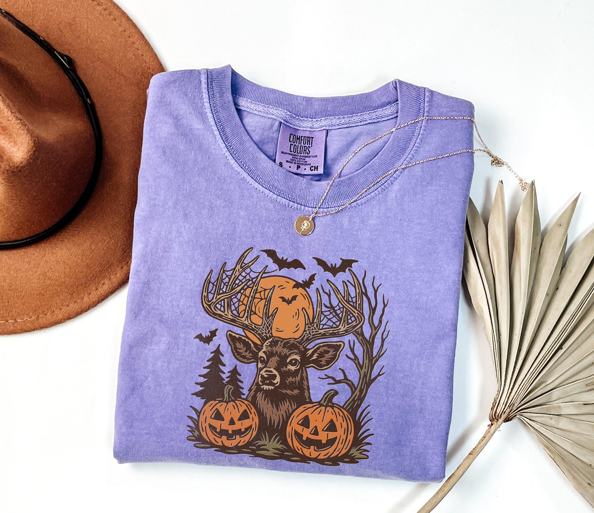 Comfort Colors® Halloween Deer Shirt, Spooky Forest Buck Shirt with Pumpkins & Bats, Rustic Hunting Halloween Shirt, Fall Antler Skull Shirt