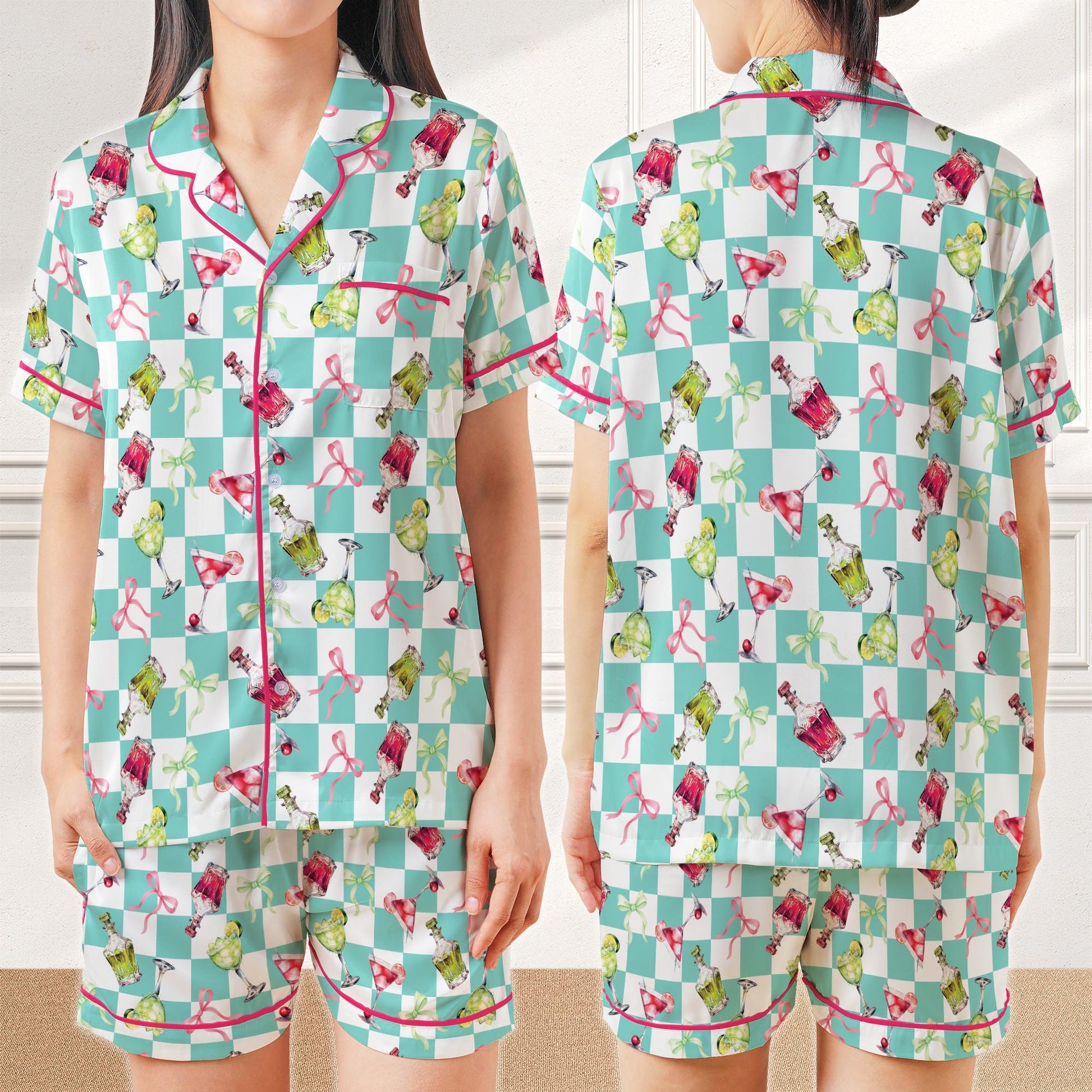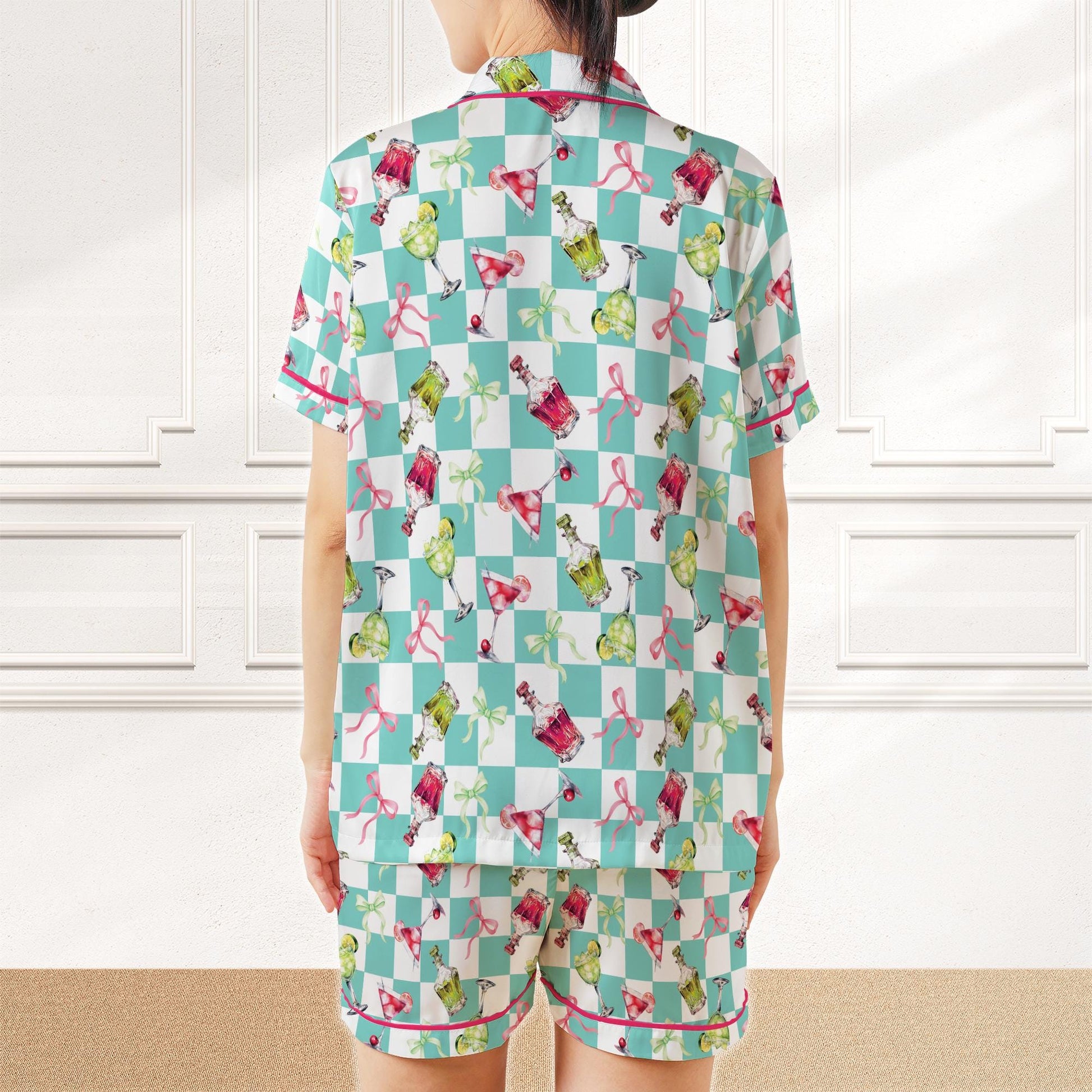 Coquette Margarita Cocktail Pajamas Set, Drinking Pajama Sleepwear Short Sleeve Pajama Set, Checkered Margarita Lover Home Wear Set