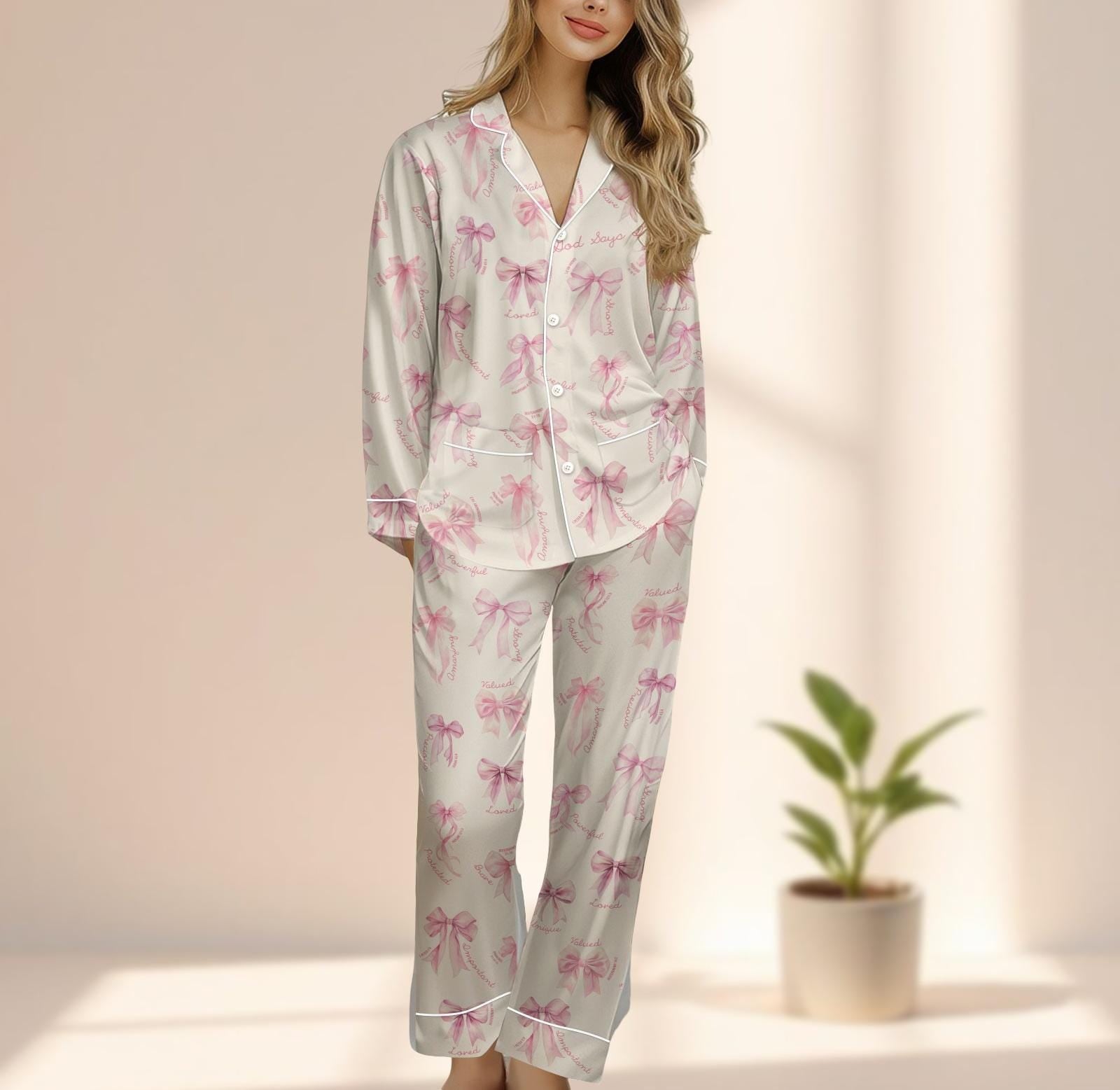 Coquette Pink Bow Satin Pajama Set, Girly Sleepwear Aesthetic, Cute Ribbon Lounge Set, Soft Feminine Matching Pajamas Set, Funny Gift