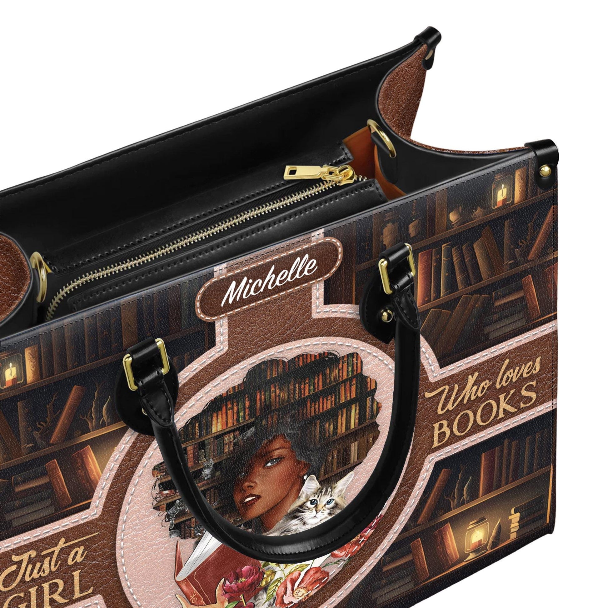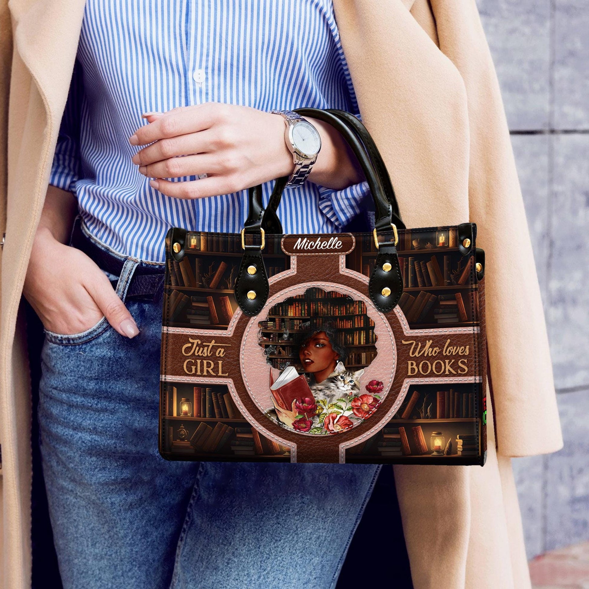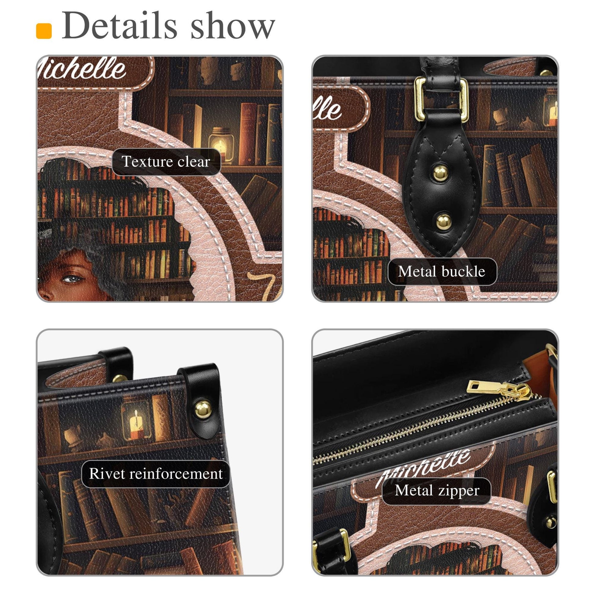 Custom Afro Girl Leather Handbag, Personalized Book Lover Purse with Cat and Flowers, Gift for Women Who Love Reading